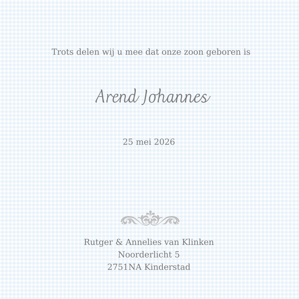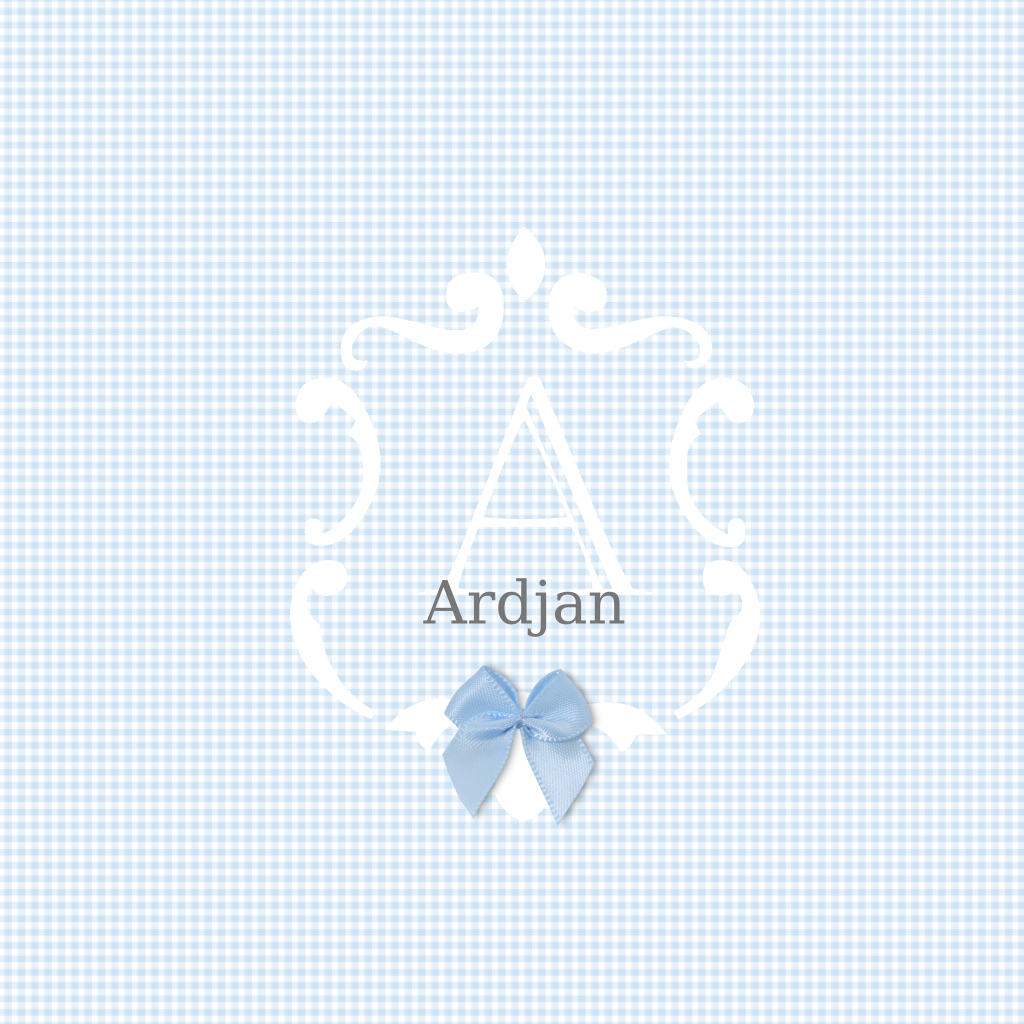 Mooi geboortekaartje voor een jongen in blauw met brocante detail. Met echt strikje. LET OP: Het strikje op dit kaartje wordt niet afgedrukt, deze is ter voorbeeld. Bij de proefdruk of eindbestelling wordt niet standaard een strikje geleverd. Op die plek kun je straks zelf het échte strikje plakken die je in het bestelproces kunt bijbestellen.(8221)