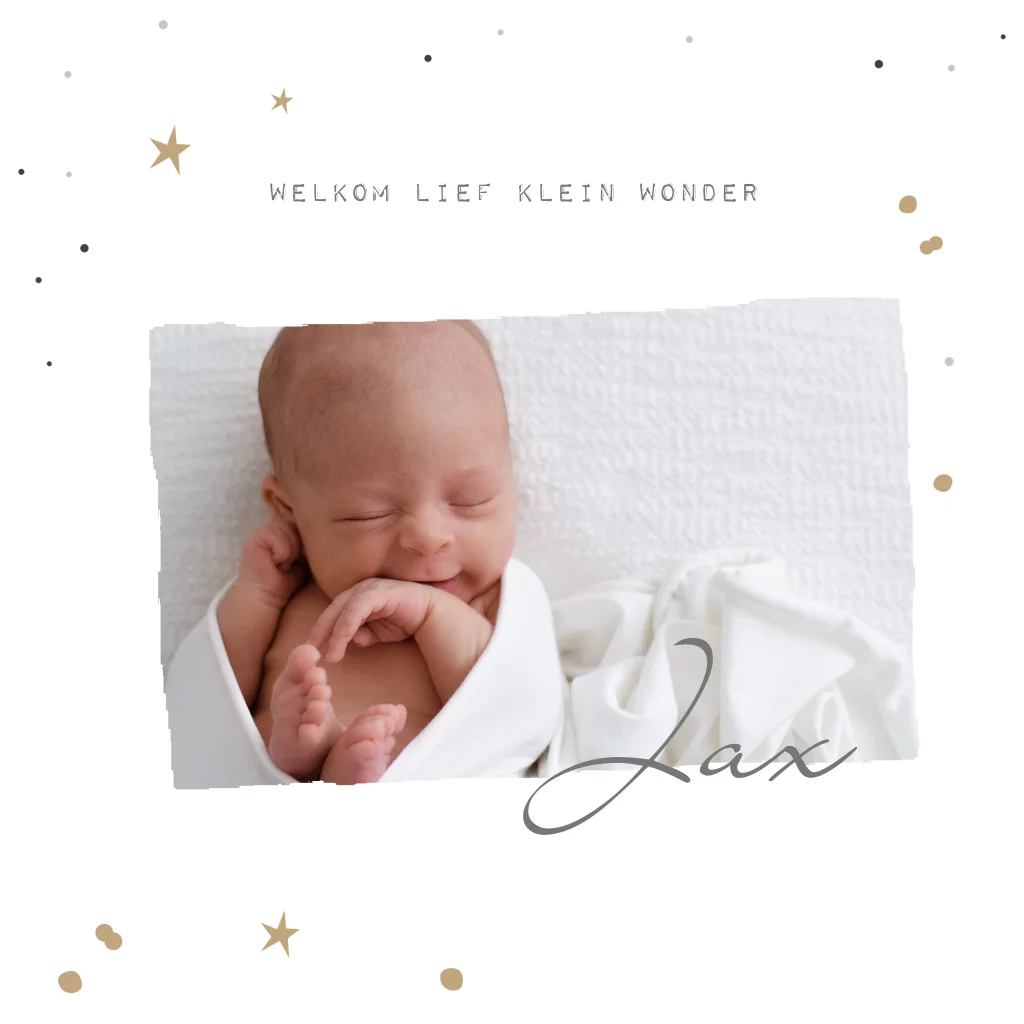 Hippe geboortekaart jongen met goud-look glitters en foto
