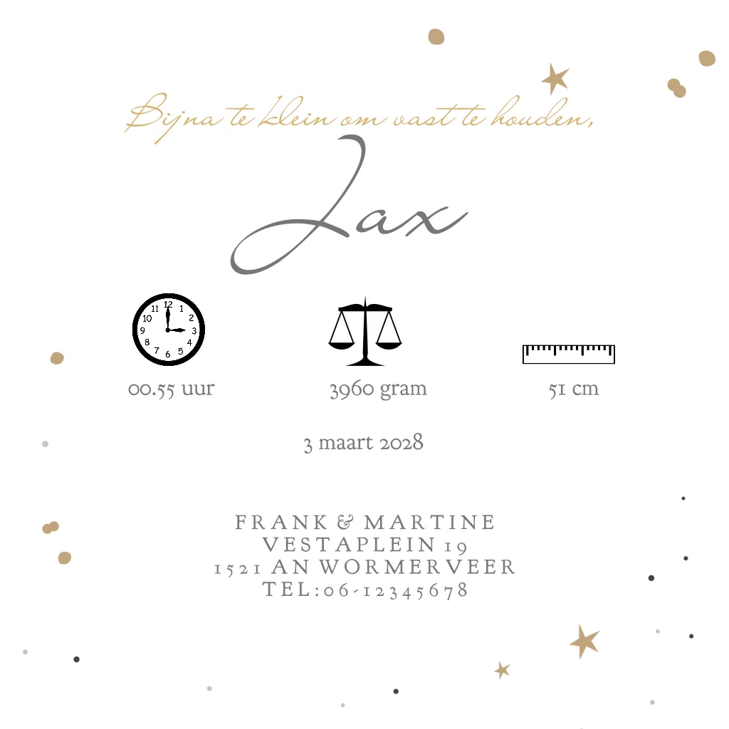 Lief geboortekaartje voor een jongen met goud-look kleurige sterren. (5279)