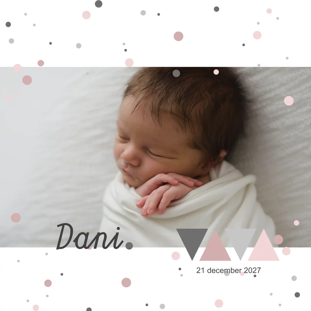 Newborn foto geboortekaartje voor een meisje met geometrische vormen. Roze kleuren en grijstinten. Vervang de foto! (7740)