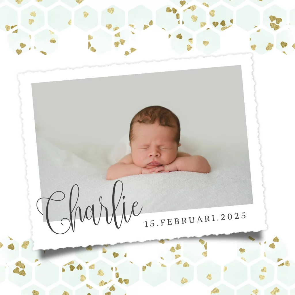 Hip geboortekaartje met een hexagon patroon. Mintgroene vormen en goud-look hartjes. (7337) Geboortekaartje Charlie