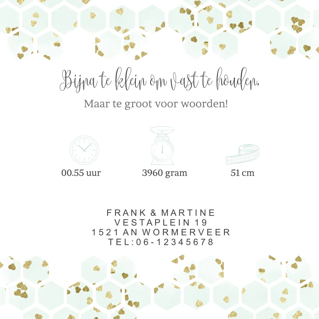 Geboortekaartje met mintgroen en gouden hartjes in hexagon
