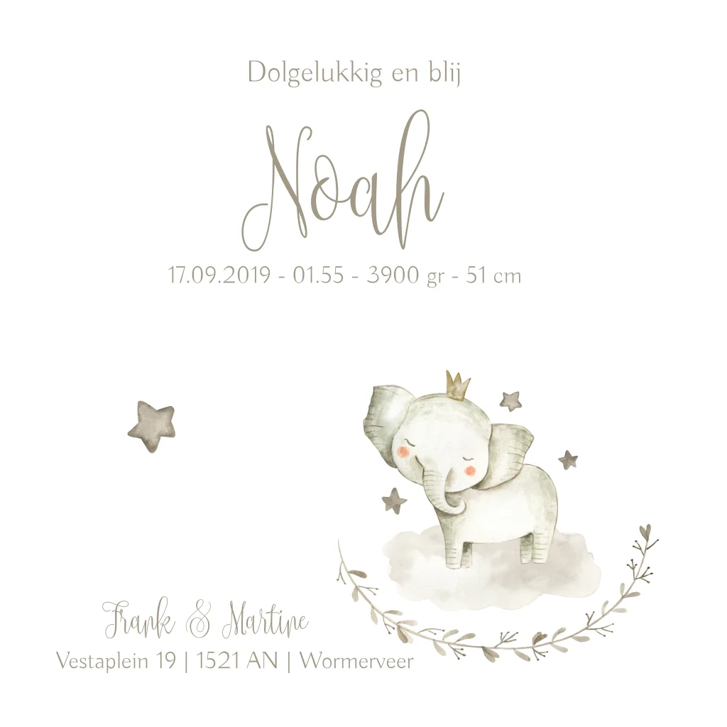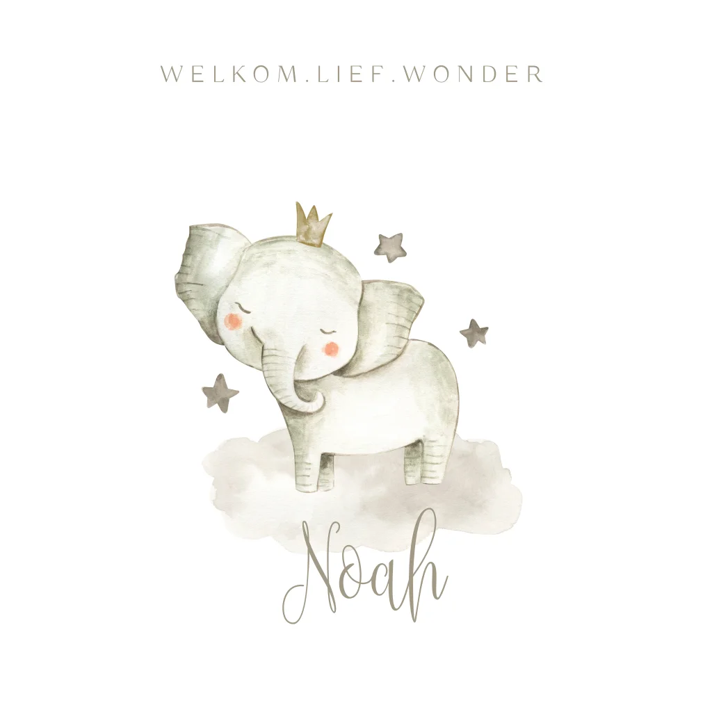 Lief geboortekaartje voor zowel een jongen als een meisje. Een lief olifantje met sterretjes en een kroontje geven hem een extra detail. (7348)
