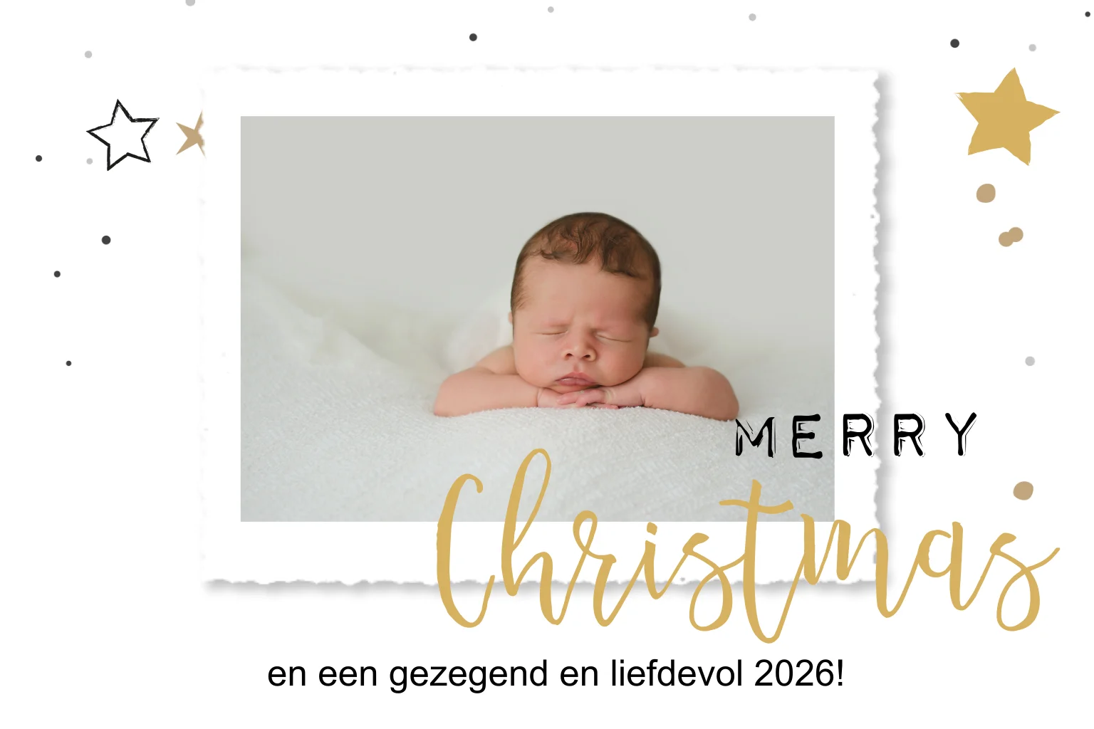 Hippe zwart wit goud gekleurde kerstkaart met foto van jouw kindje(s). (6130)