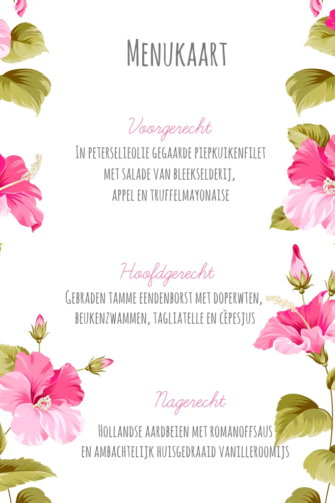 Hippe menukaart met rozen en groene bladeren. Gratis verzending binnen Nederland en België. (3260).
