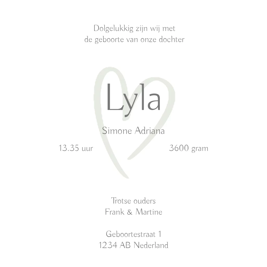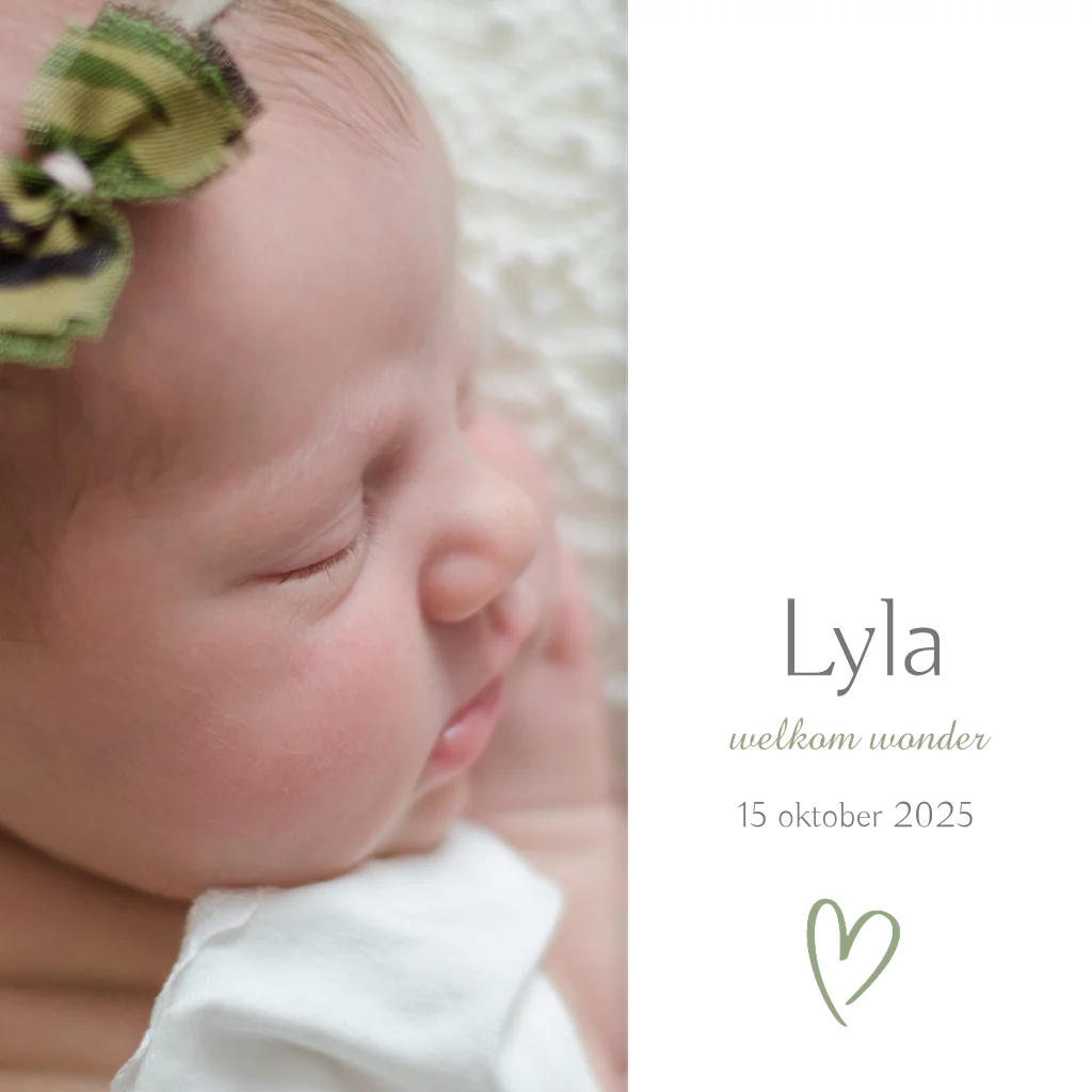 Lief geboortekaartje voor meisjes met een eigen foto er in. Hartje is gemakkelijk in kleur te veranderen. (6360)
