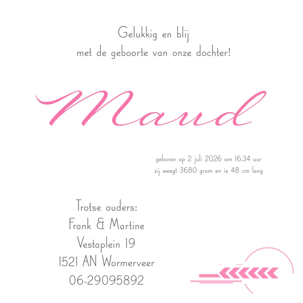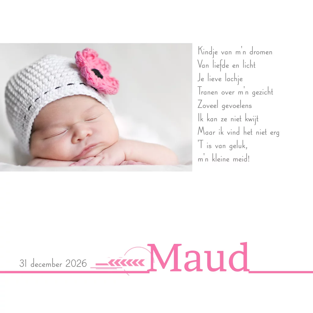 Lieve foto geboortekaart meisje roze details. Witte achtergrond. (883)