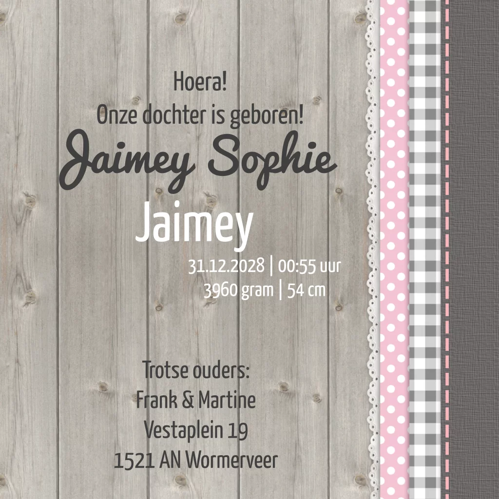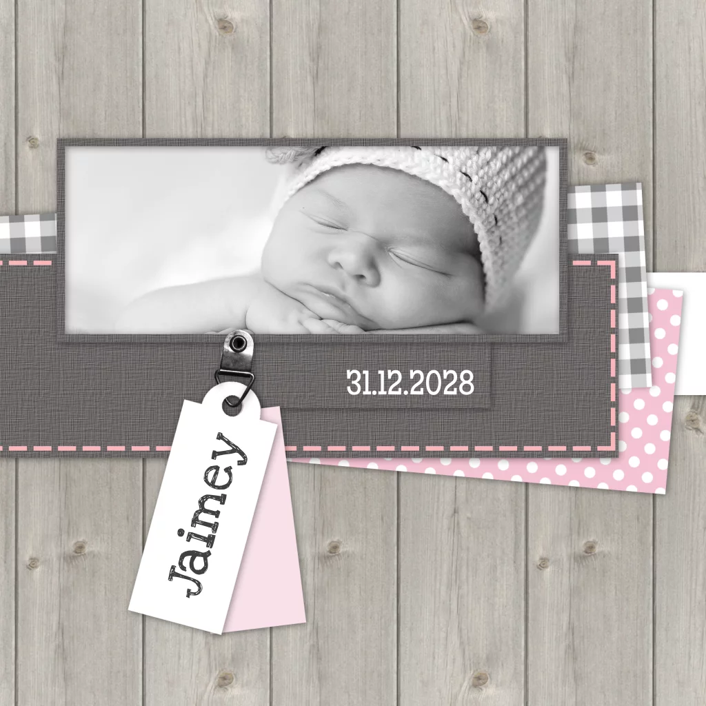 Geboortekaart meisje met steigerhouten planken en eigen foto. Licht roze stippeltjes patroon en ruitjes. (9)