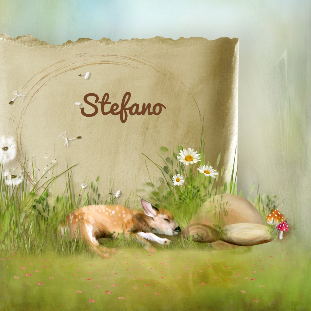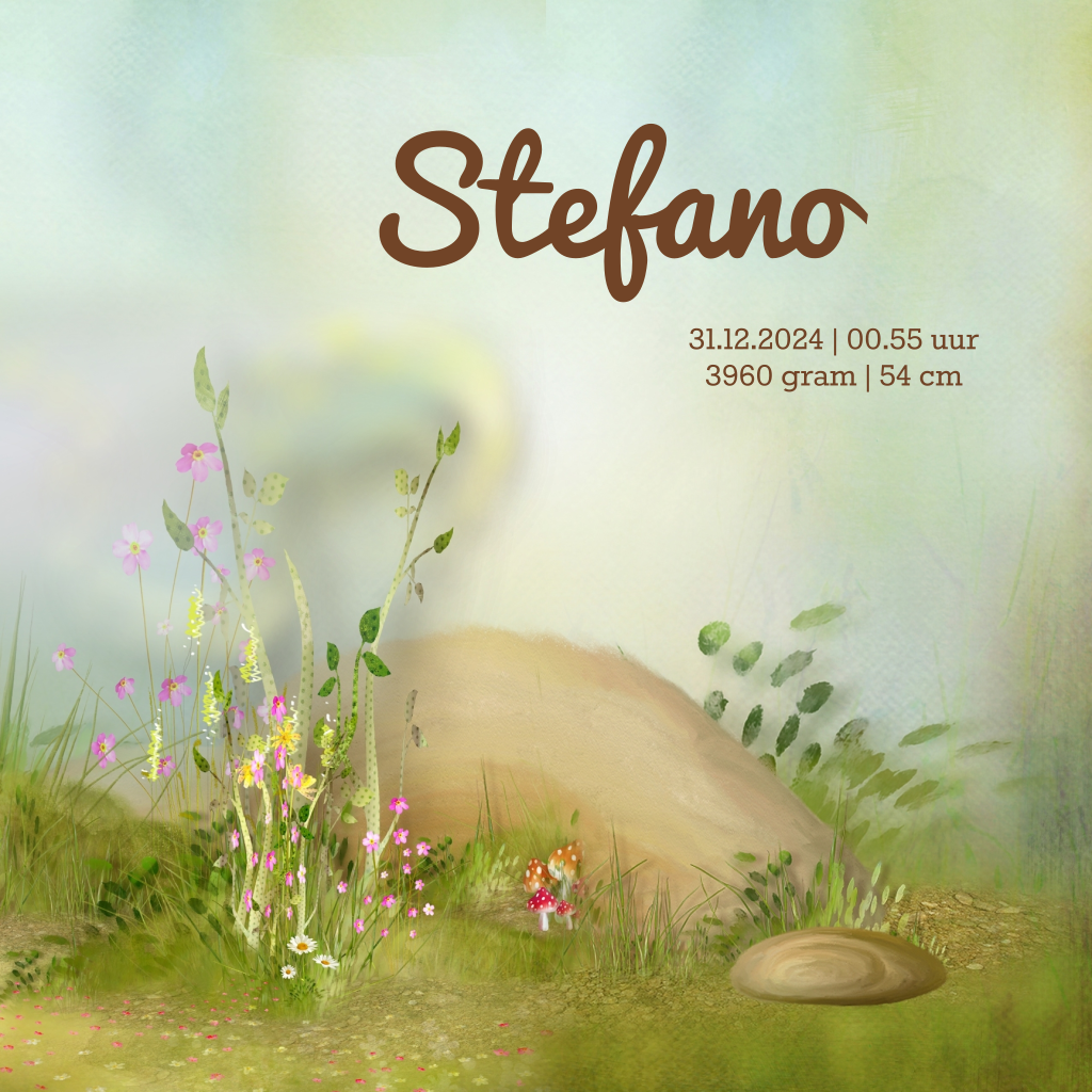 Sprookjes geboortekaartje met bambi in het gras. Paddestoelen rood met witte stippen. (875)