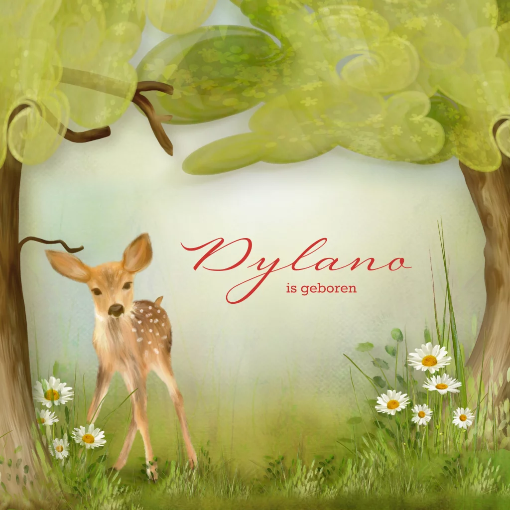 Sprookjes geboortekaartje met hertje in het bos en madeliefjes