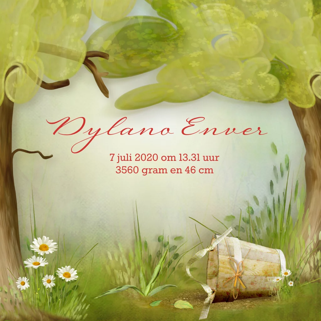 Sprookjes thema geboortekaartje met hertje in het bos en madeliefjes. Groen gras en bomen. (876)