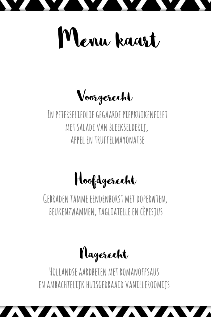 Trendy menukaart met zwart wit patroon. Bestel voor 1 euro jouw proefkaartje. Gratis verzending binnen Nederland en België. (3393)