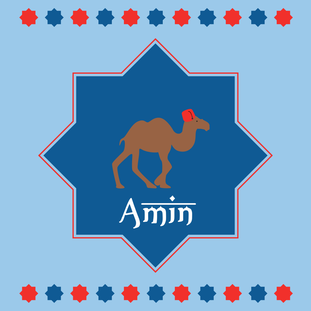 Arabisch / islamitsch kaartje voor een thara feestje. Licht blauw mozaiekvorm met kameel.