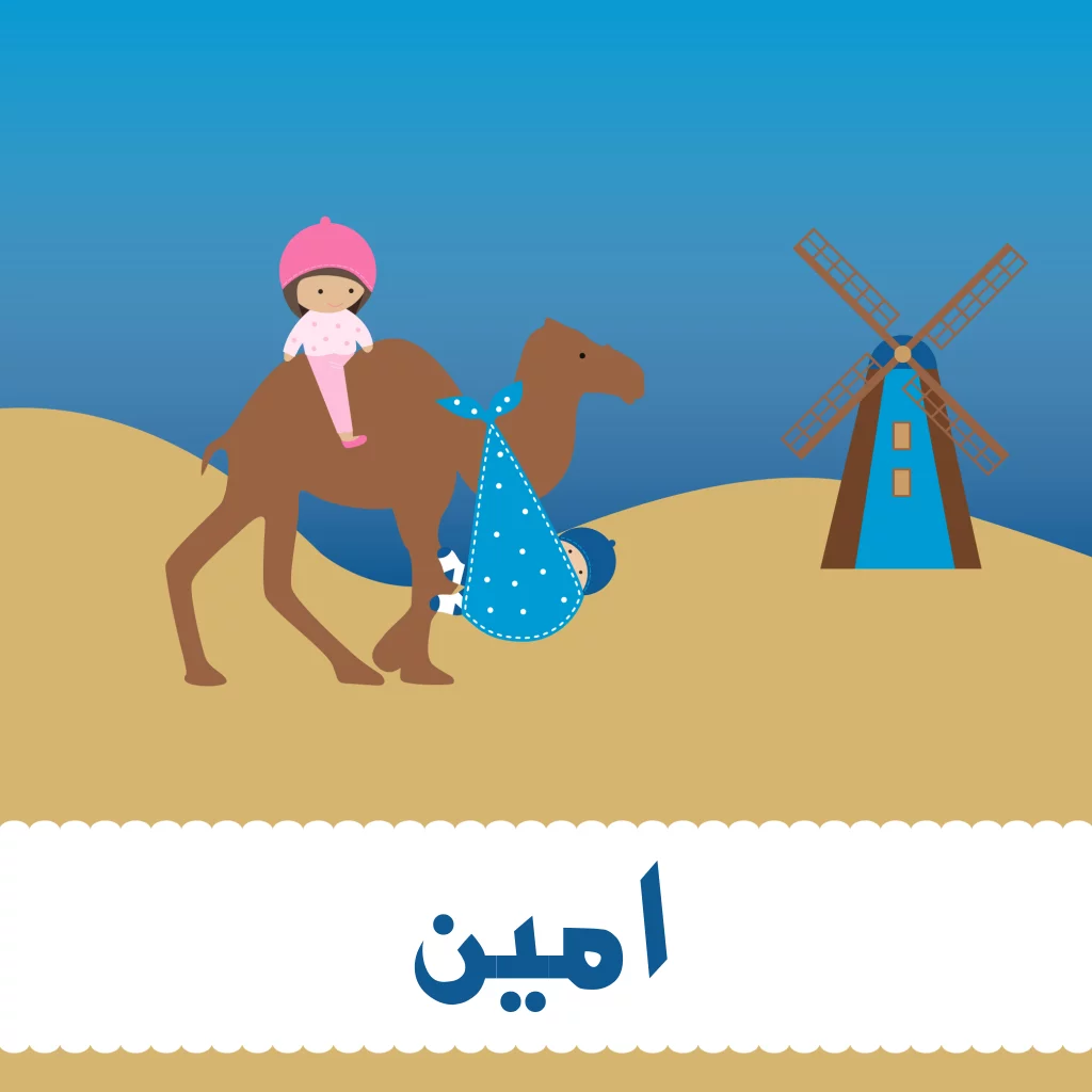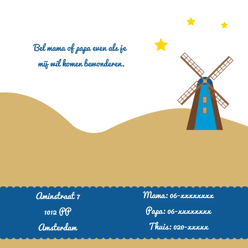 Arabisch / islamitsch geboortekaartje jongens voor een tweede kindje met een grote zus. Met kameel in de woestijn en molen. Kindje in een blauwe draagdoek. Tulpen op de achterkant.