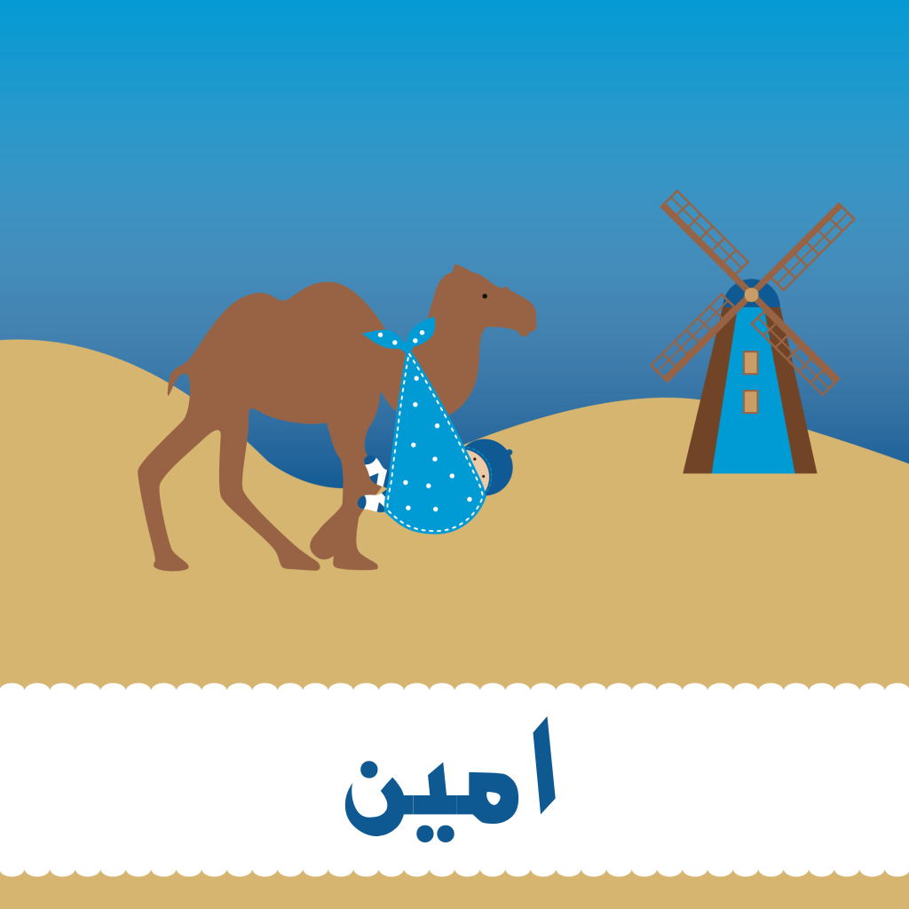 Arabisch / islamitsch geboortekaartje jongens. Met kameel in de woestijn en molen. Kindje in een blauwe draagdoek. Tulpen op de achterkant. Een donker blauwe achtergrond kleur.