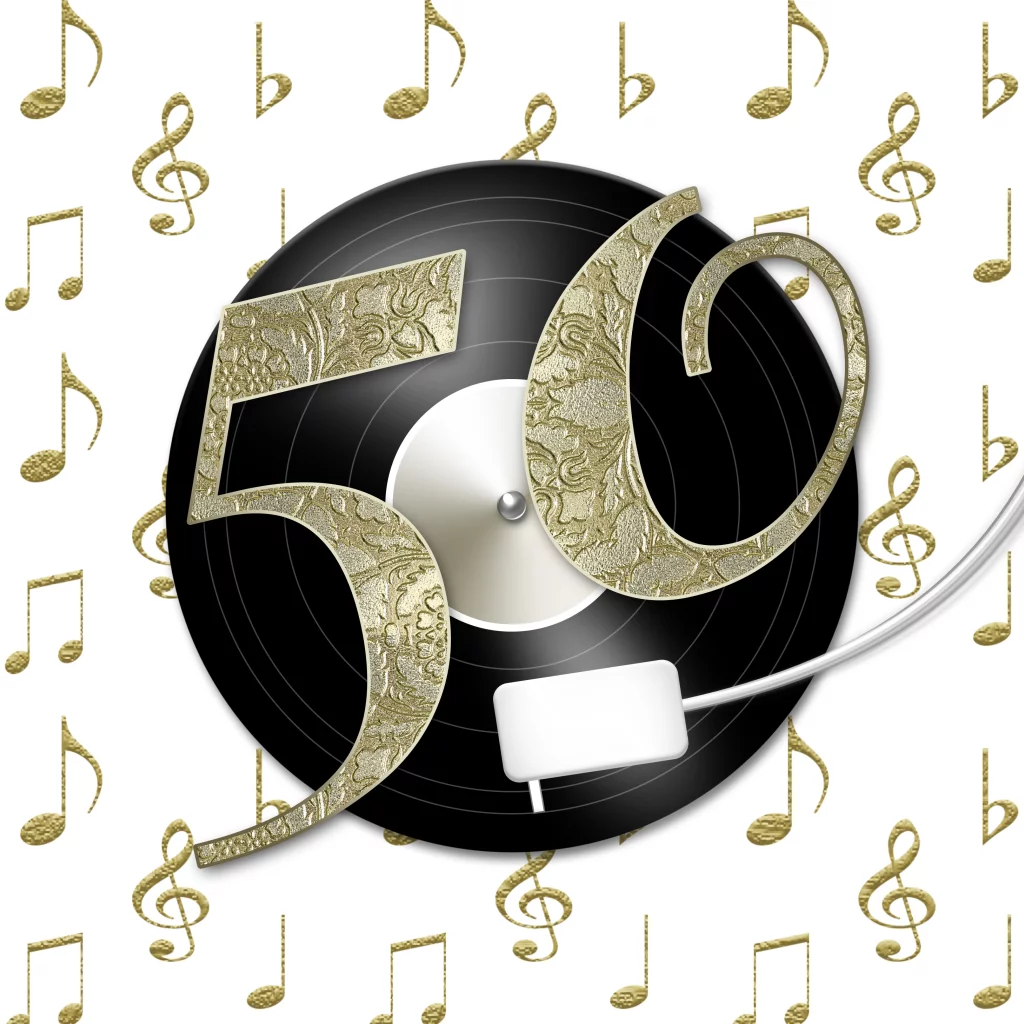 Uitnodiging voor een 50e verjaardag met een lp en muzieknoten
