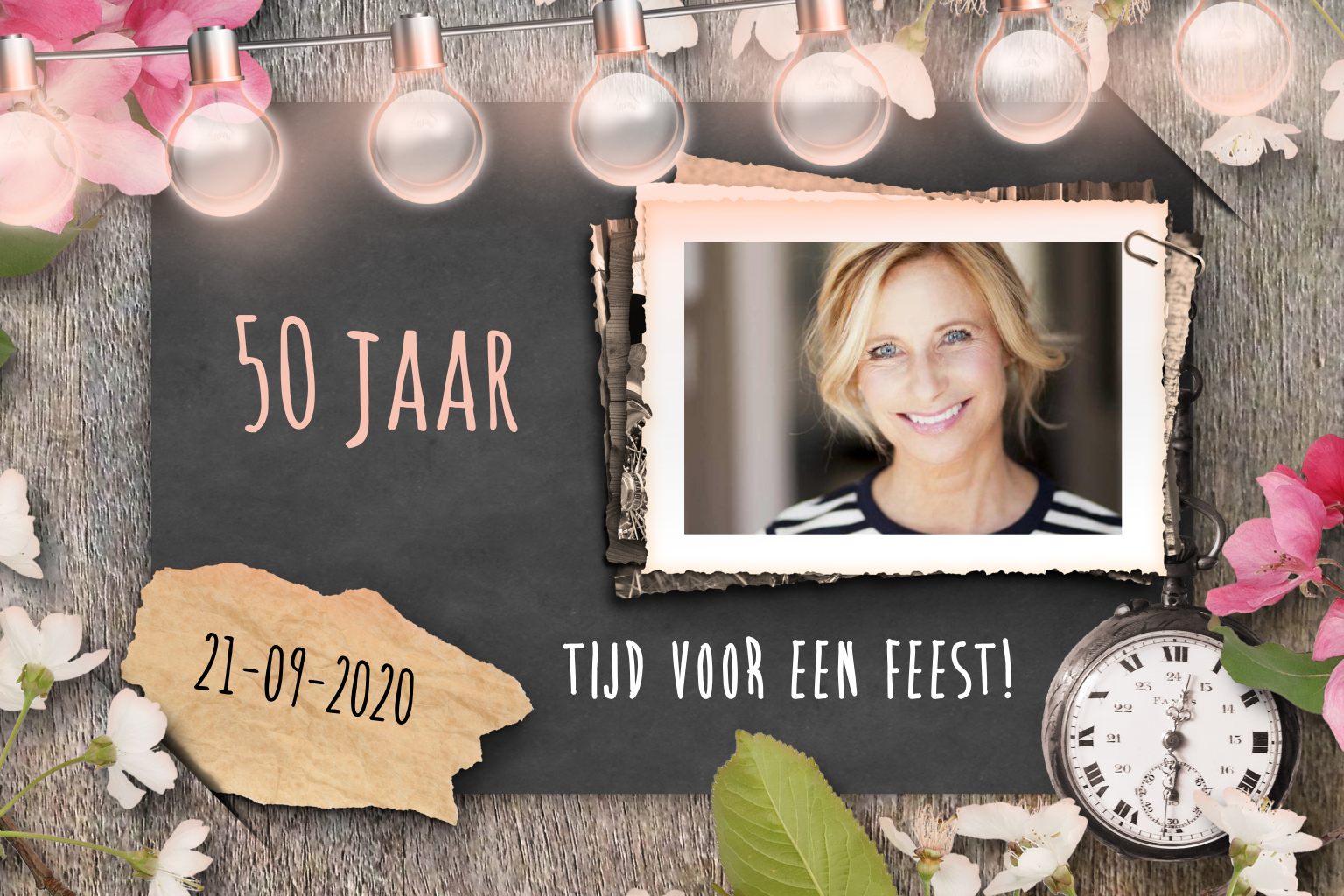 Uitnodiging 50ste verjaardag met lampjes en hout