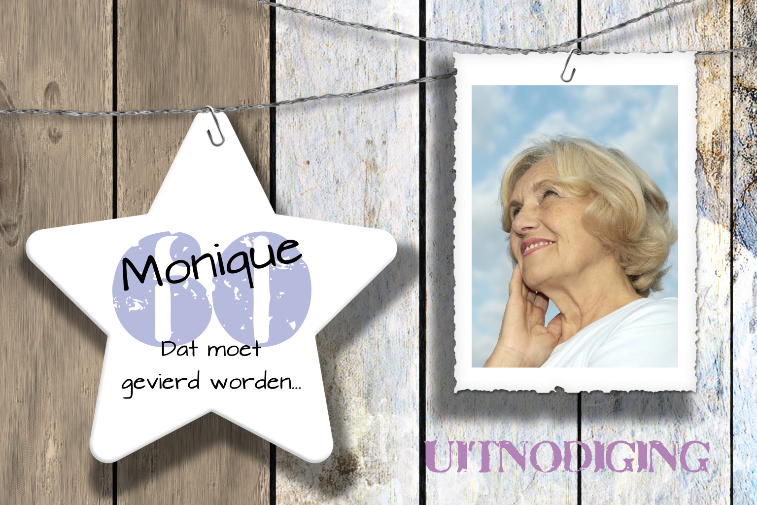 Een trendy kaart 60e verjaardag met hangende ster en foto op een robuuste houten achtergrond. (4436)