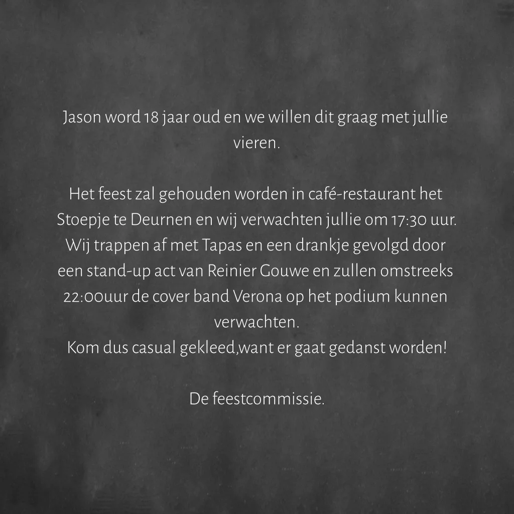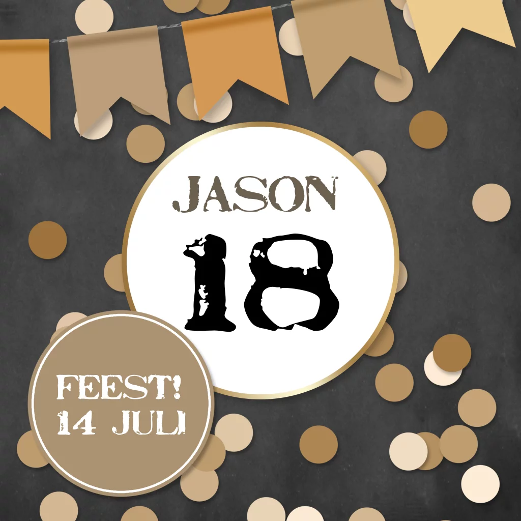 Uitnodiging 18e verjaardag met confetti en vlaggetjes. De bruine button op de voorzijde is schaal en verplaatsbaar. (6489)