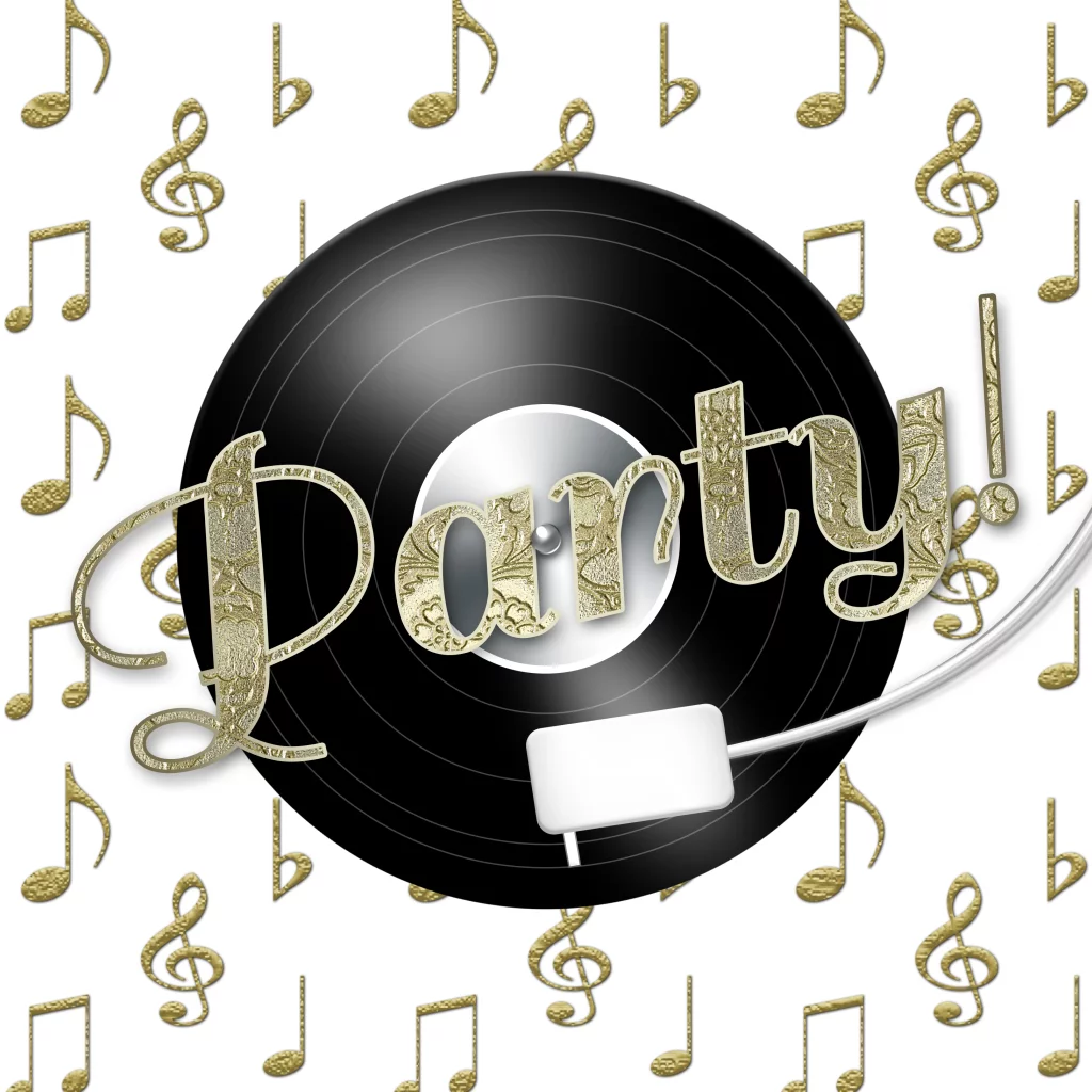 Uitnodiging party in goud met platenspeler en goud gekleurde muzieknoten disco en muziek. (5448)