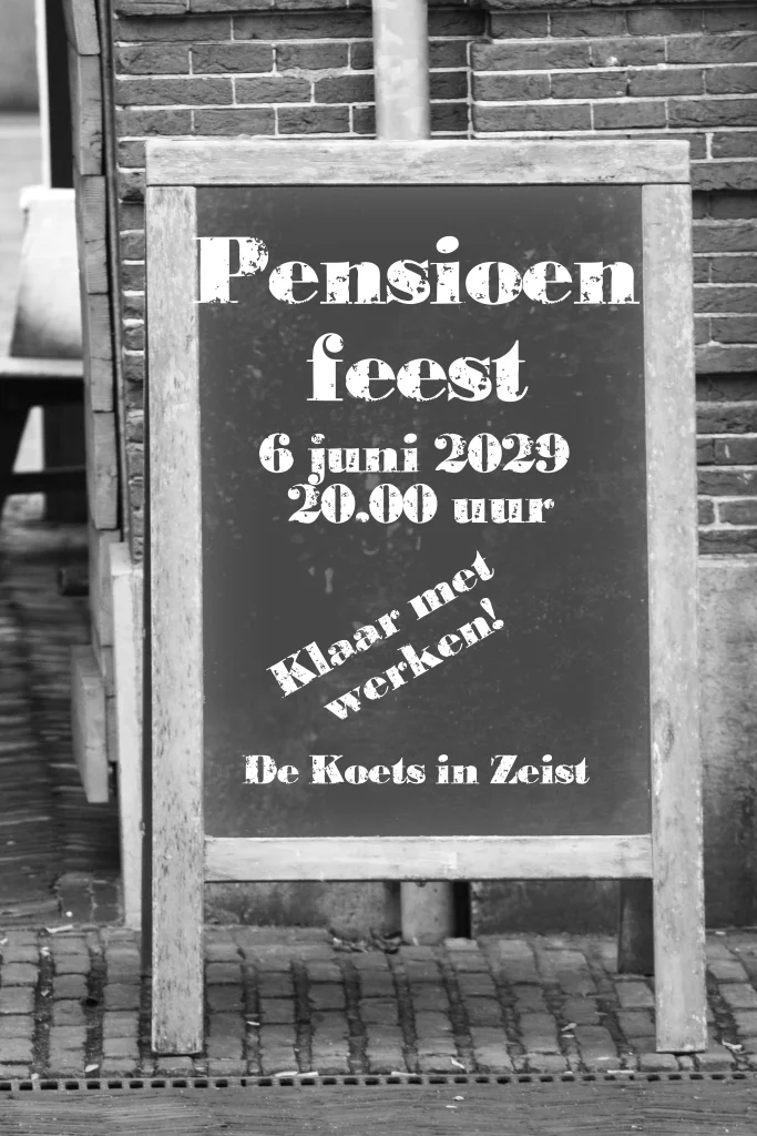 Uitnodiging voor een pensioen feestje op een stoep houten krijtbord Op de hoek van een straat.