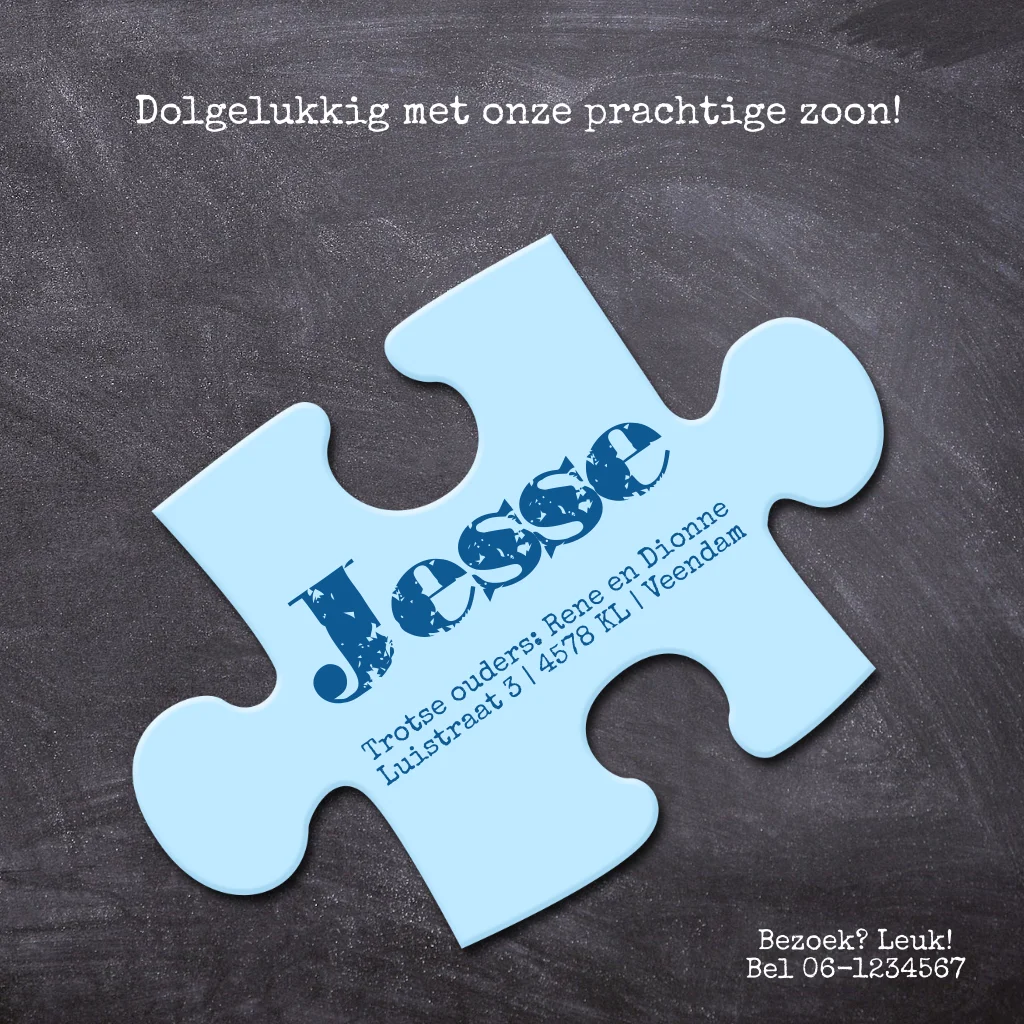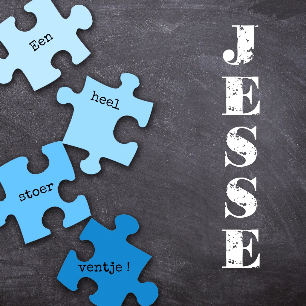 Geboorte kaart jongen met school bord en puzzelstukjes. In verschillende tinten blauw. (762)