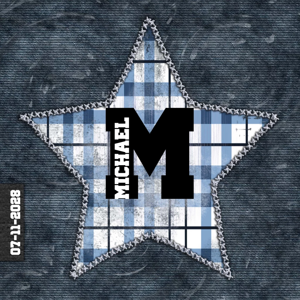 Spijkerstof geboortekaartje voor een jongen. Met grote ster op de voorkant met licht blauwe ruitjes. (13)