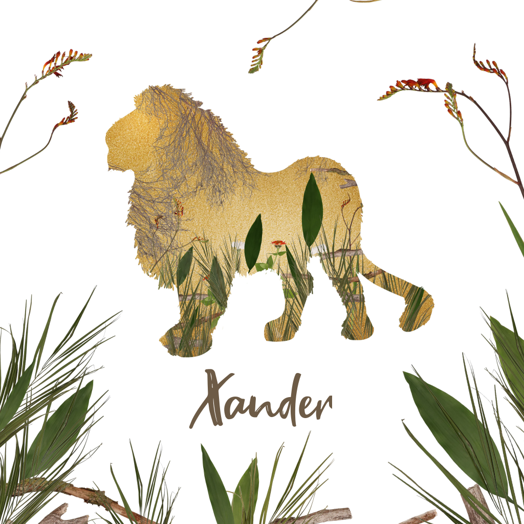 Een stoer geboortekaartje met het silhouet van een leeuw gemaakt van kraftpapier look, bloemen, takjes en planten. (22081)