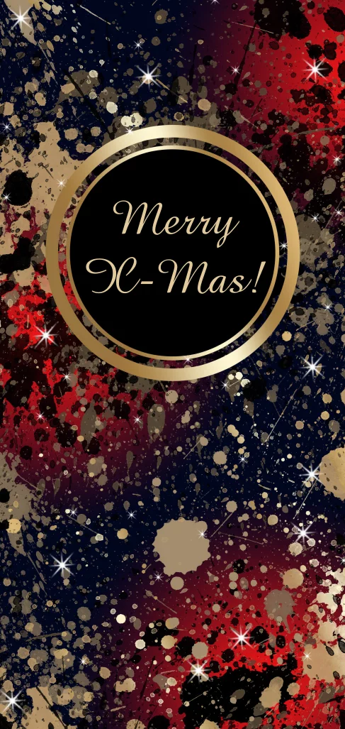 Een stijlvolle kerstkaart met een goudkleurige ring op een spetterende achtergrond met rood licht en goudkleurige details. (6309)