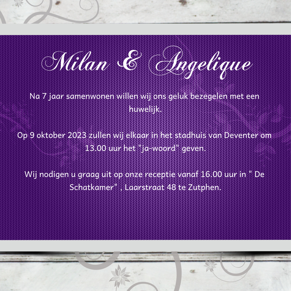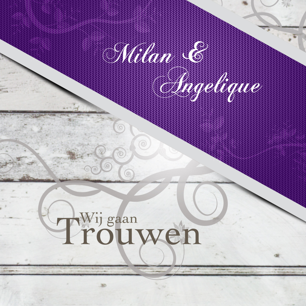 Trouwkaart met sierlijke ornamenten en zilver met paars lint. Planken op de achtergrond. (61) trouwkaarten