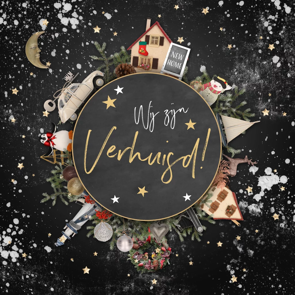 Een vrolijke verhuiskaart voor de feestdagen met veel feestelijke elementen als kerstballen, takken, sneeuwman. (21538)