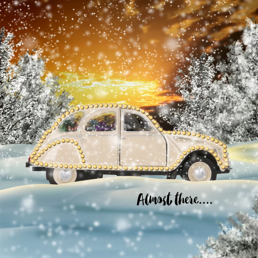 Een winters tafereel. Een lelijke eend op weg naar huis rijdend door een besneeuwd landschap. (6124)