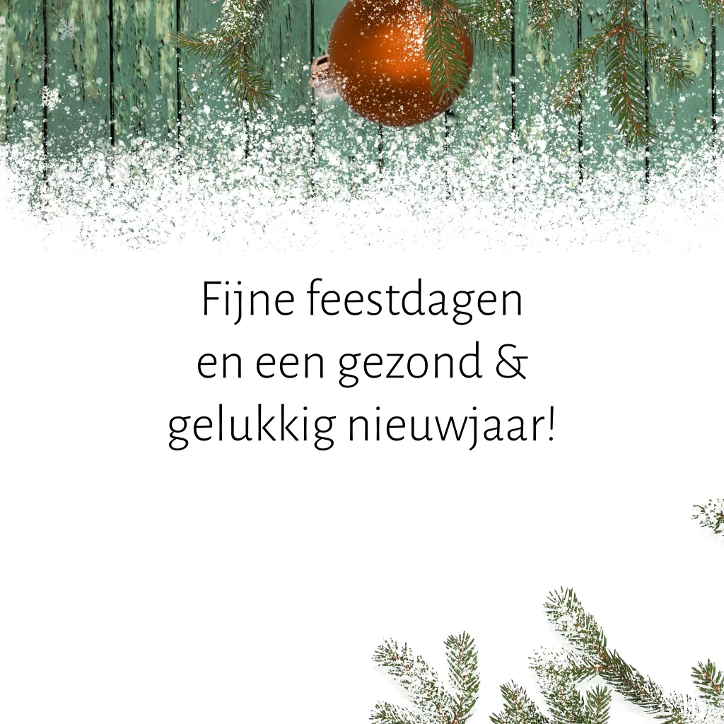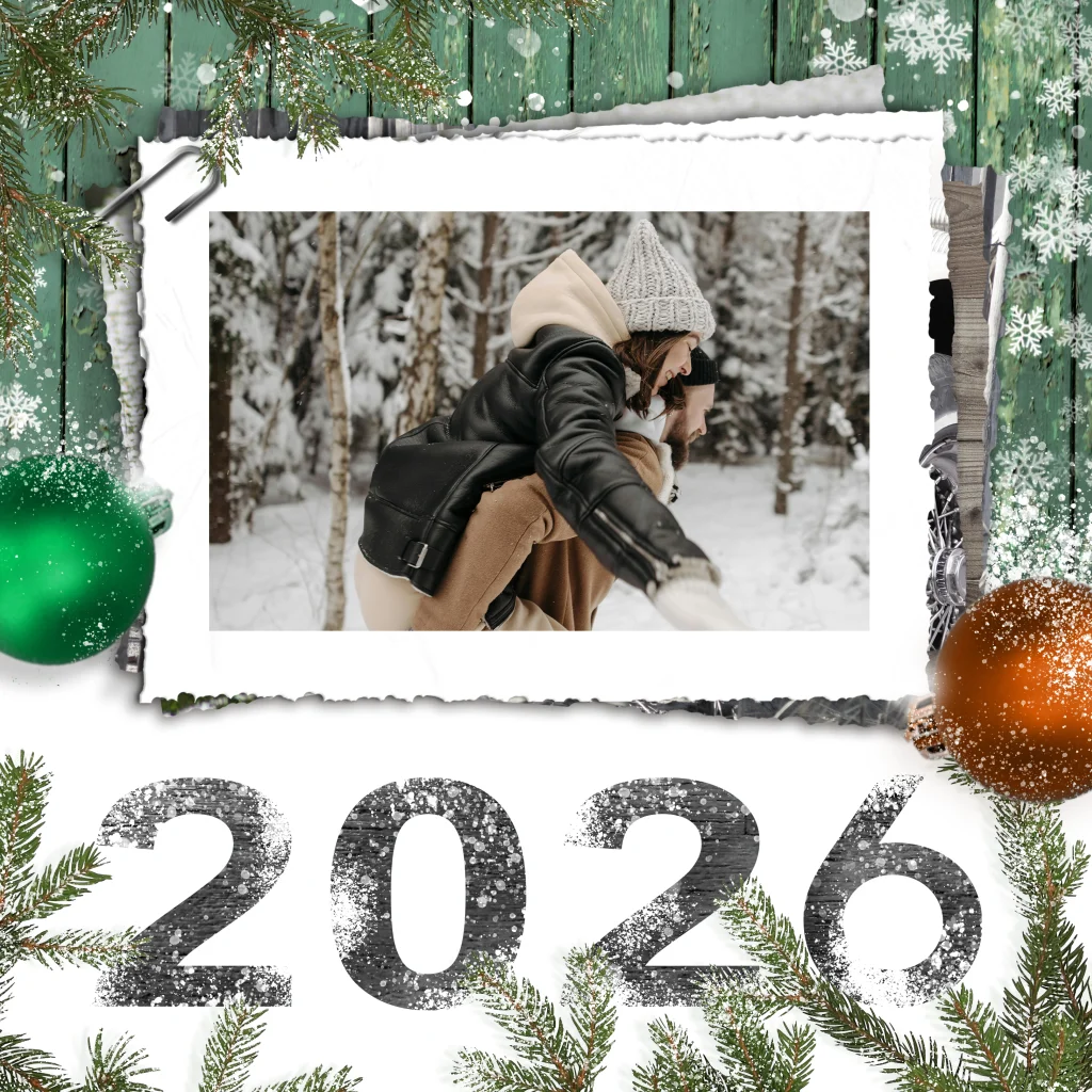 Een winterse kerstkaart met een foto liggend op een fotostapel met een achtergrond van hout, sneeuw, takken en kerstballen