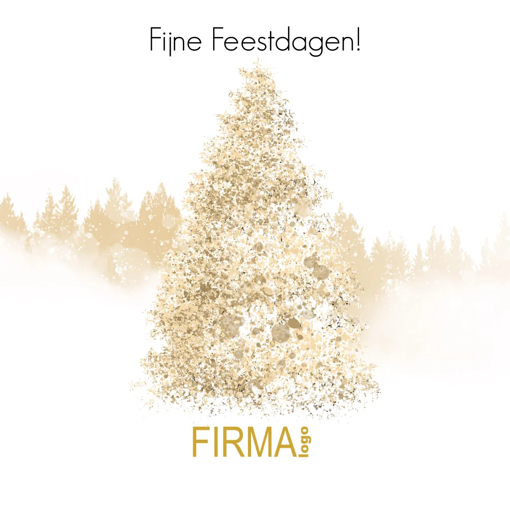 Een sfeervol tafereel met een gouden kerstboom op de voor en winters bos op de achtergrond. (24319)