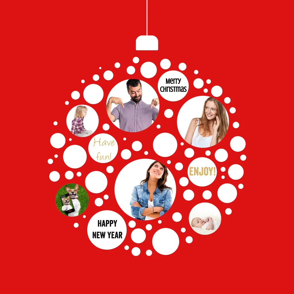 Een leuke trendy kaart met kerstbal waar je foto's en/of teksten in kan plaatsen. (20624)