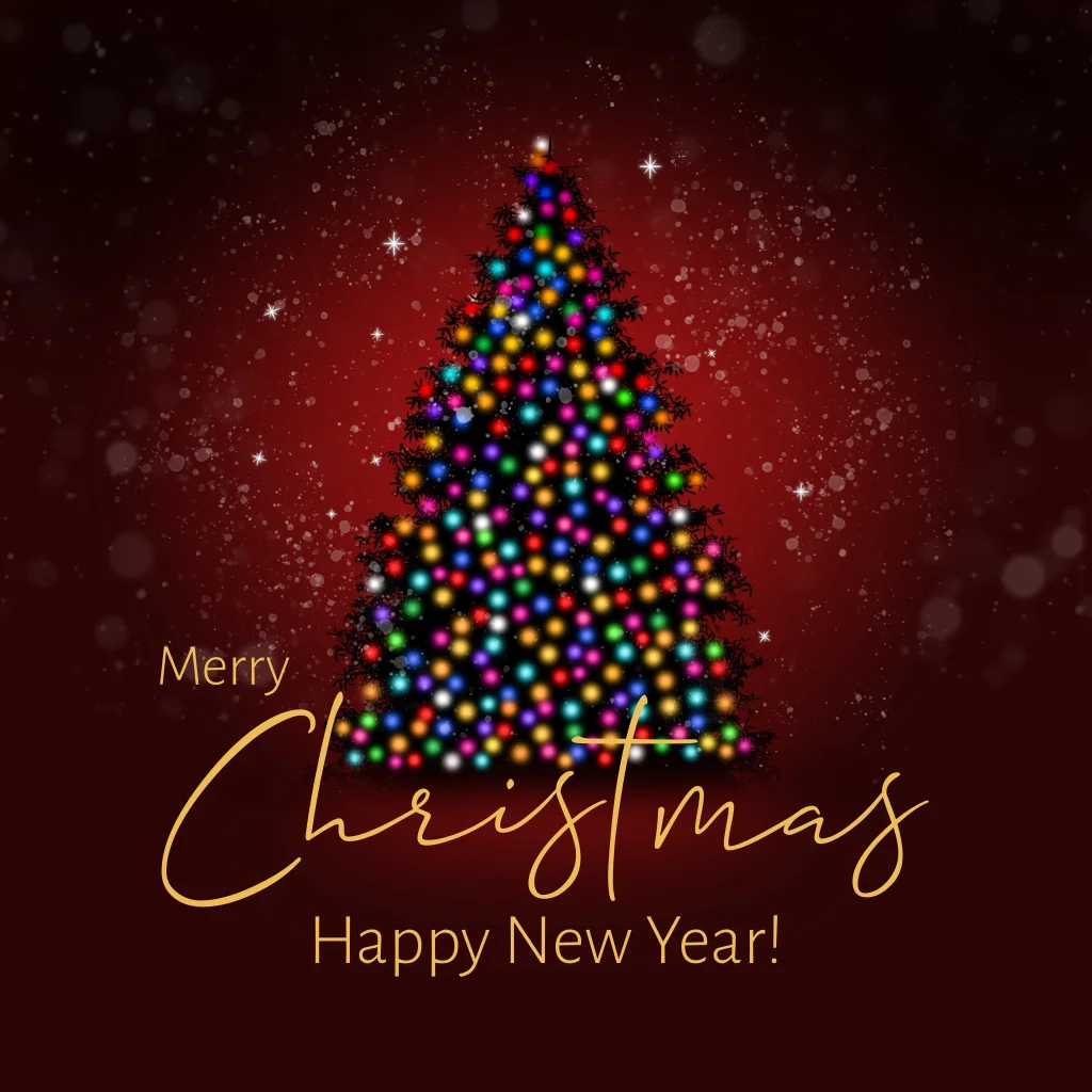 Een feestelijke kerstkaart met een kerstboom met daarin vrolijke kleurrijke lichtjes in allerlei kleuren. De kleur van de kaart is rood de de kaart heeft tekst Merry Christmas.