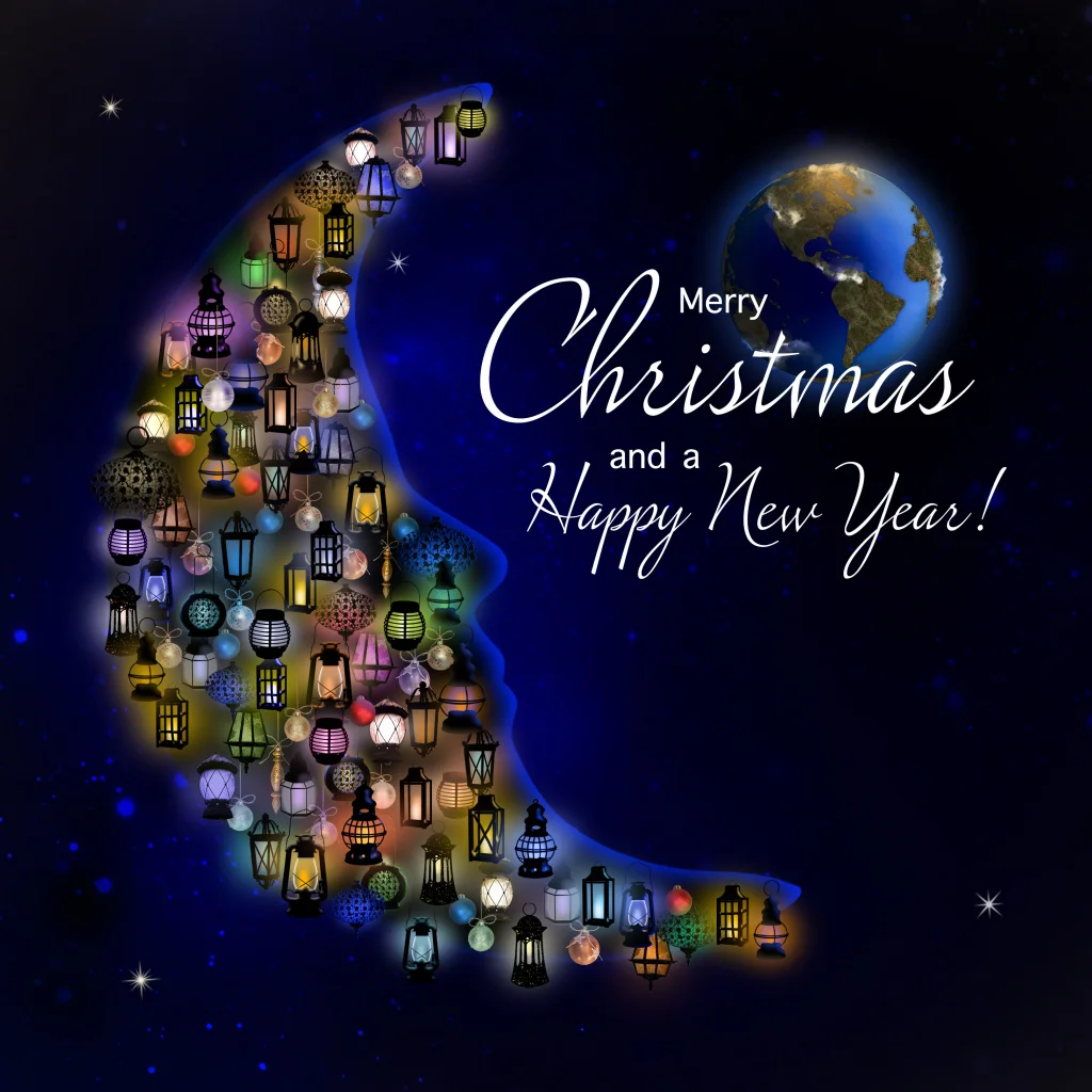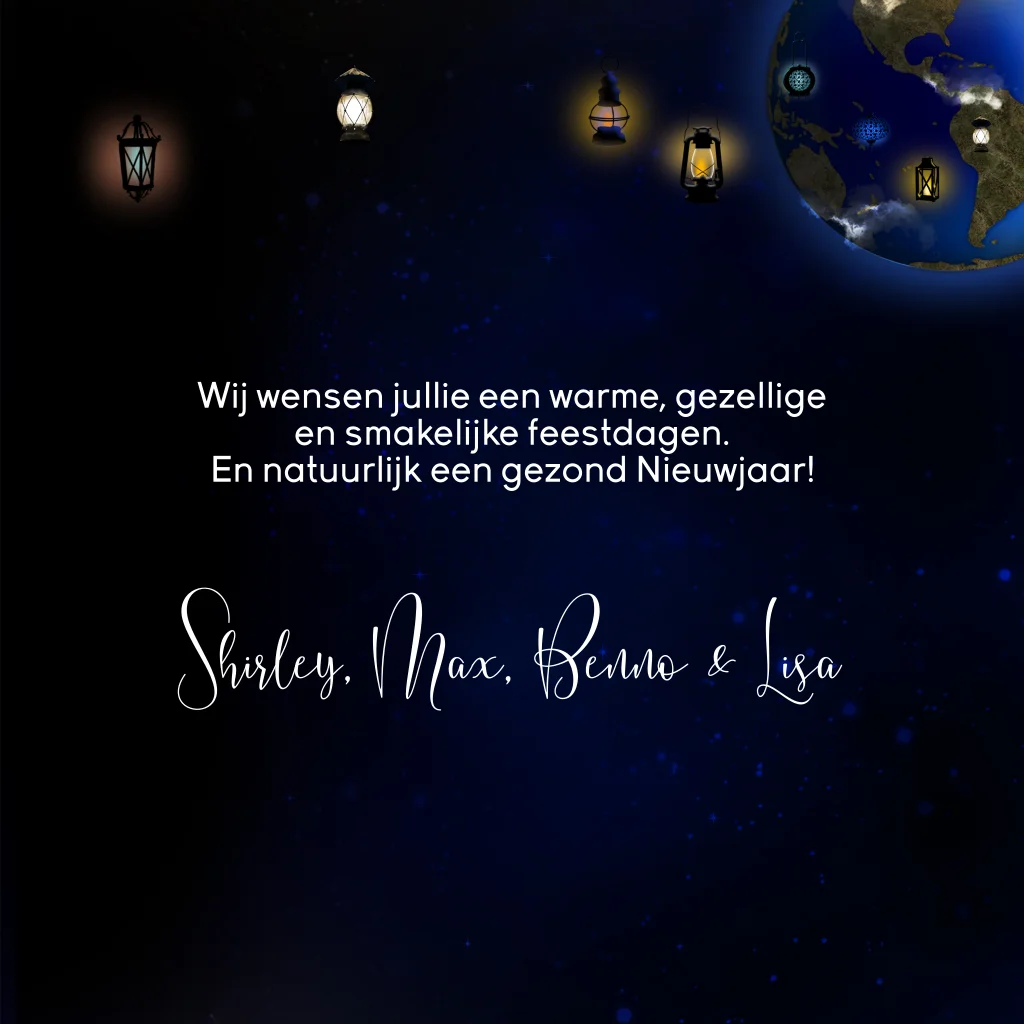 Een vrolijk en sfeervol kaartje met een maan vol lantarens die zijn licht schijnt op de aarde. (24299)