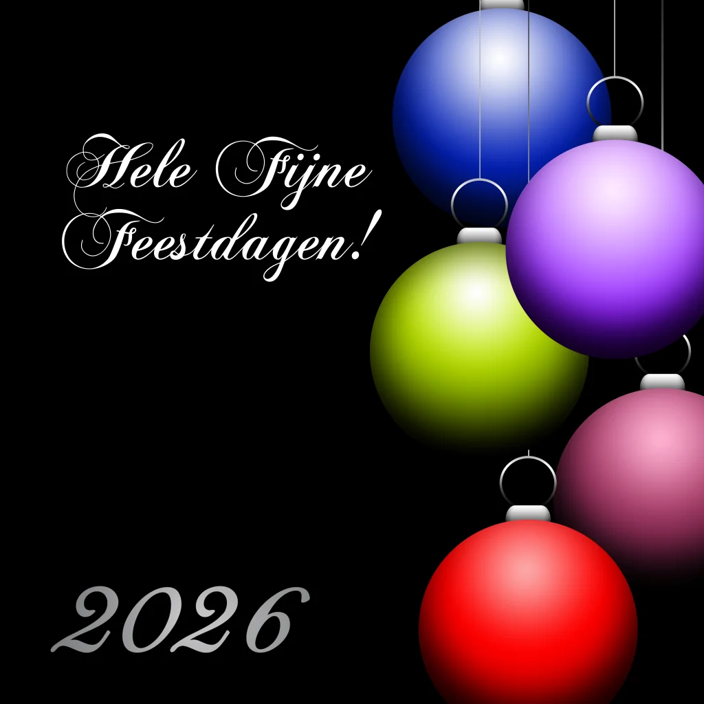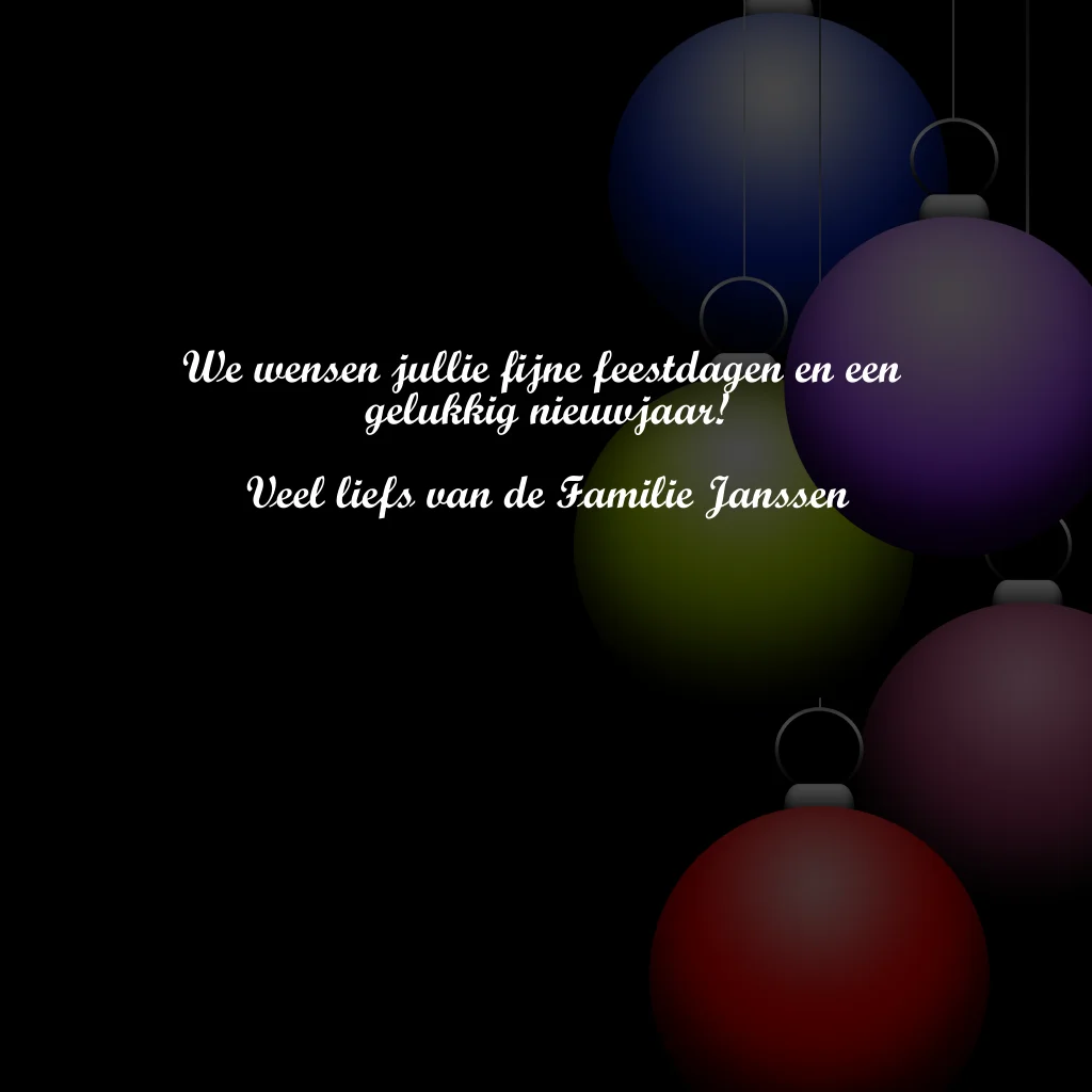 Kerstkaart met grote gekleurde kerstballen aan een touw in de kleuren, blauw, paars, geel en rood.(964)