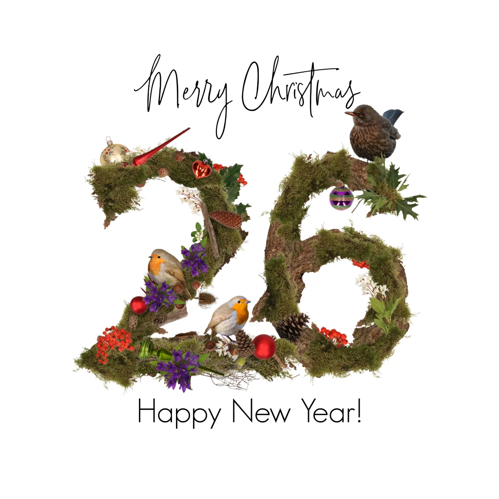 Kerstkaart roodborstjes en bos 2026 cijfers