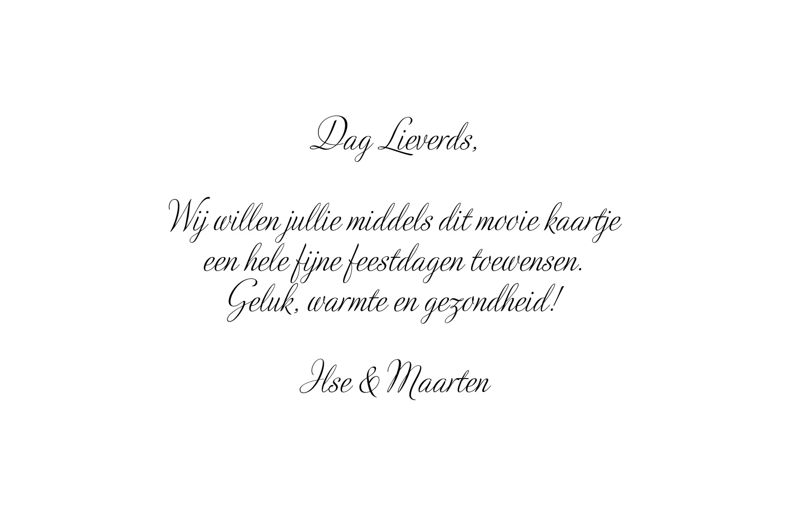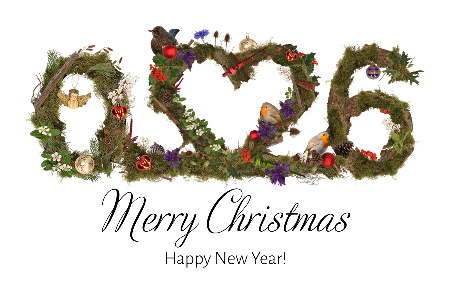 Een sfeervol kerstkaart 2026 bostafereel met roodborstjes, een merel, mos, takjes, kerstballen en meer vrolijkheid. (24259)
