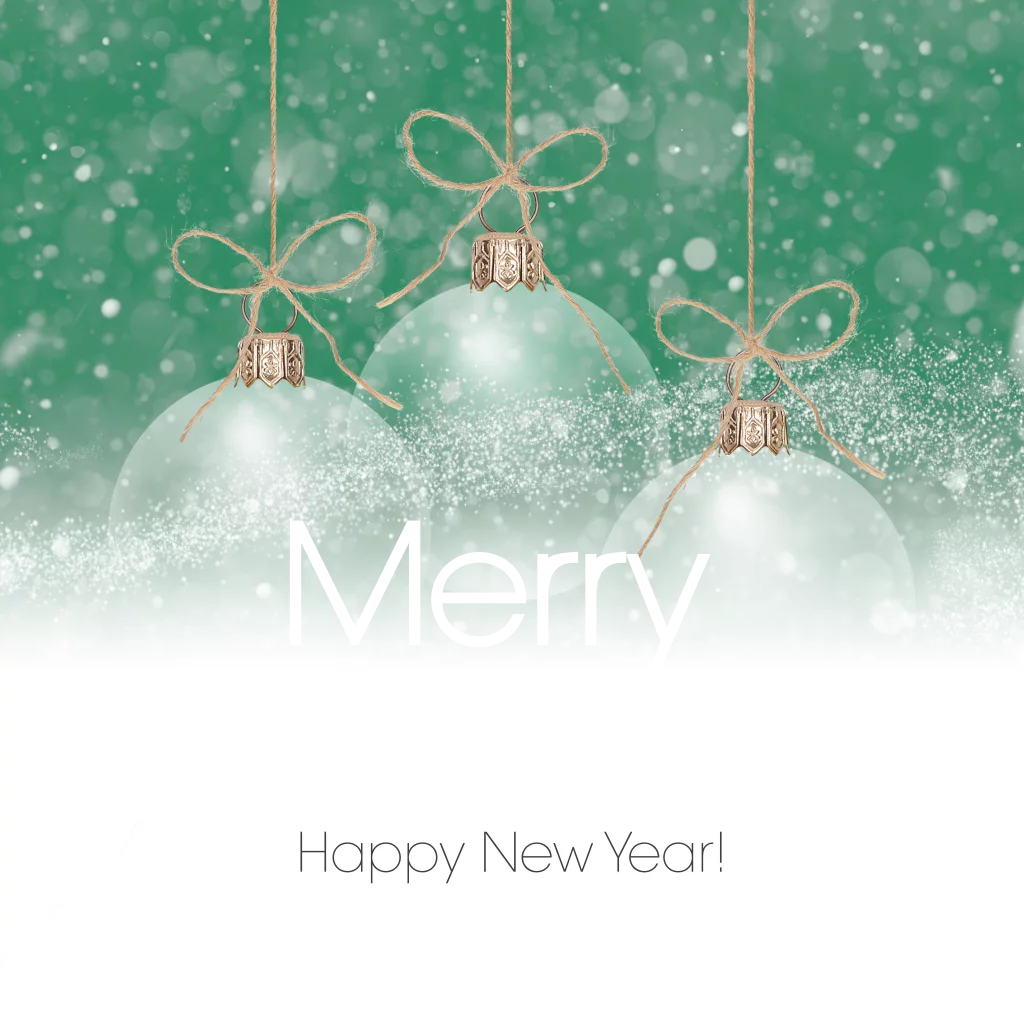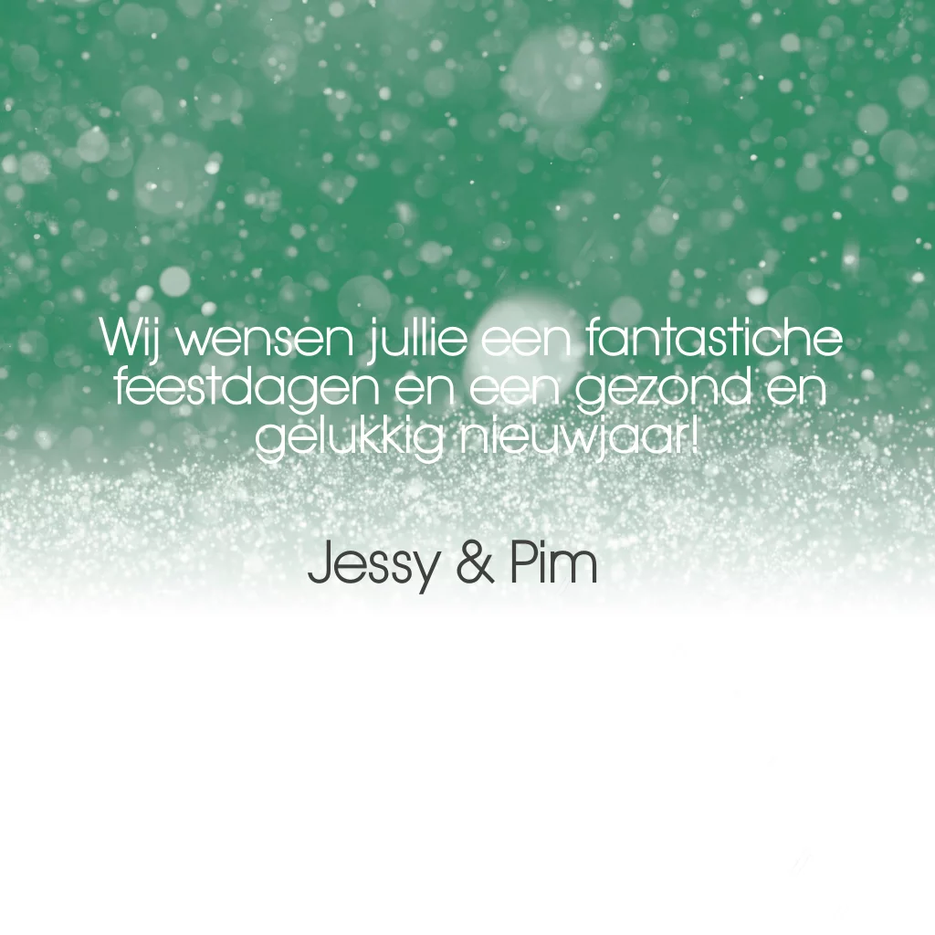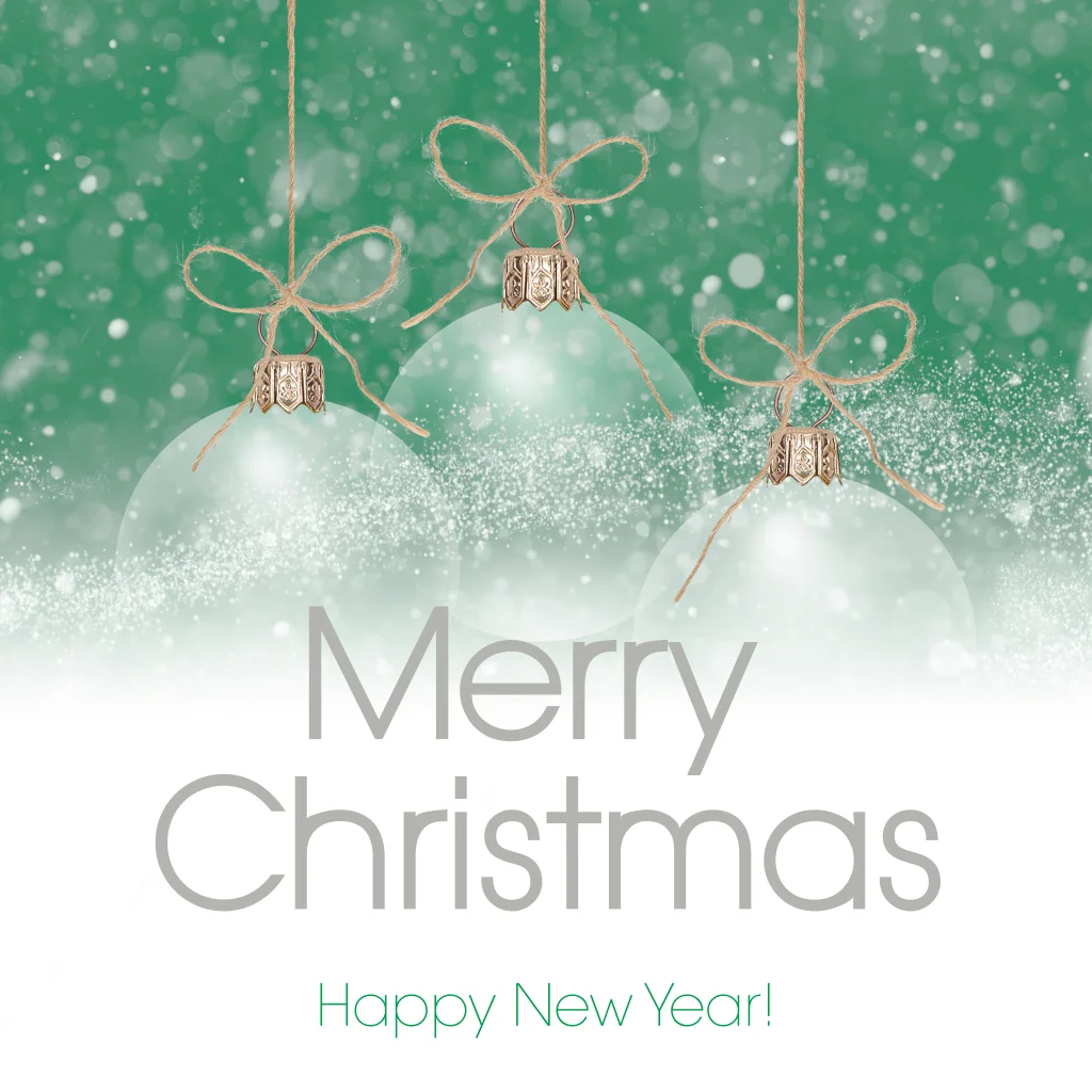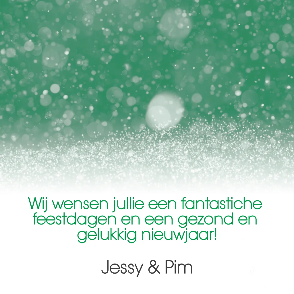 Een vrolijke kerstkaart met doorzichtige kerstballen op een groen besneeuwde achtergrond. Met aan de binnenzijde ruimte voor een eigen foto. (23457)