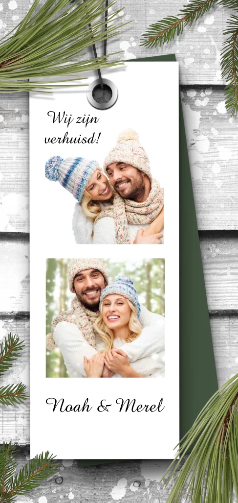 Een hippe sfeervolle verhuiskaart met label, foto's en hout op de achtergrond. (7592)