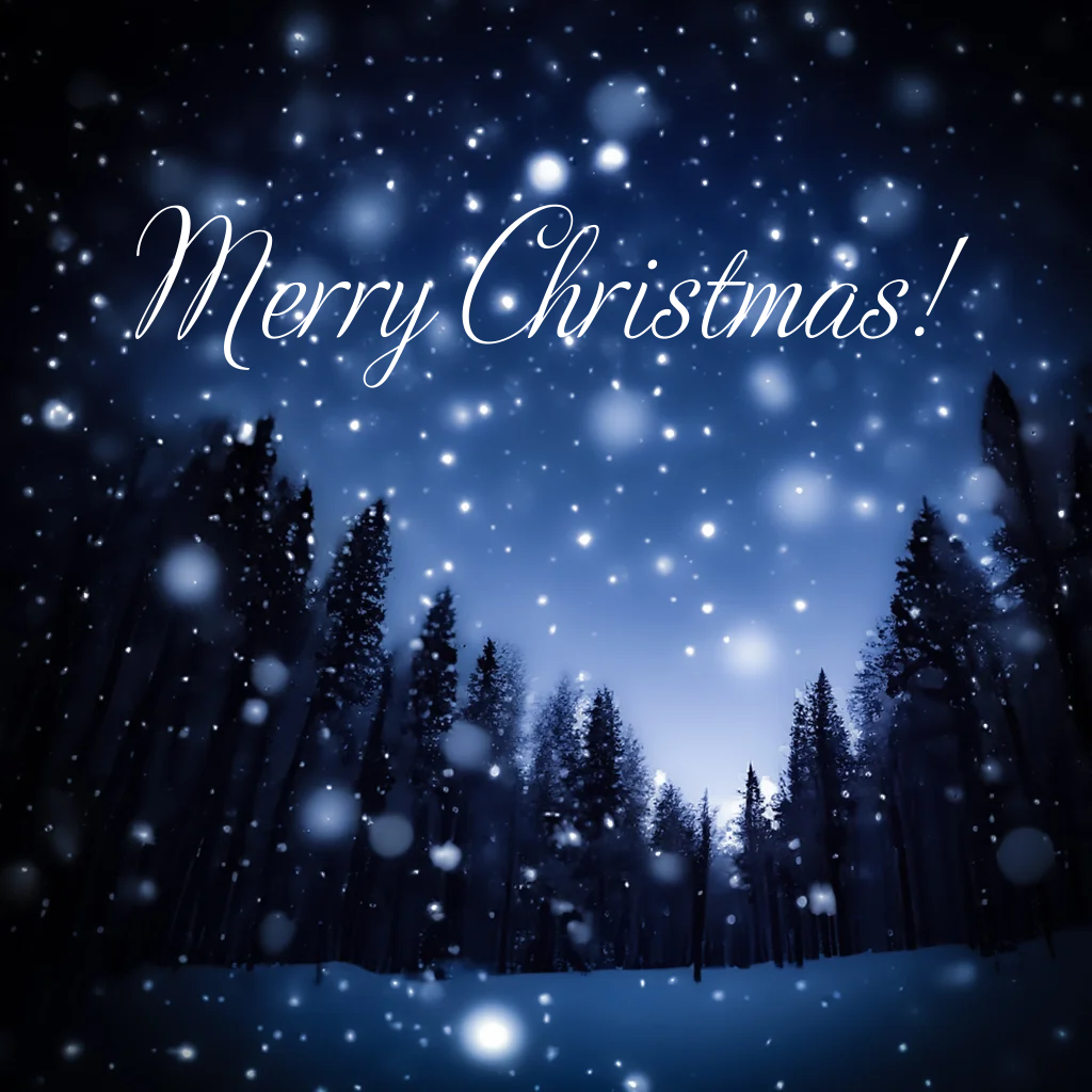 Een winterse kerstkaart met besneeuwd woud / bos en vallende sneeuwvlokken. (30335)