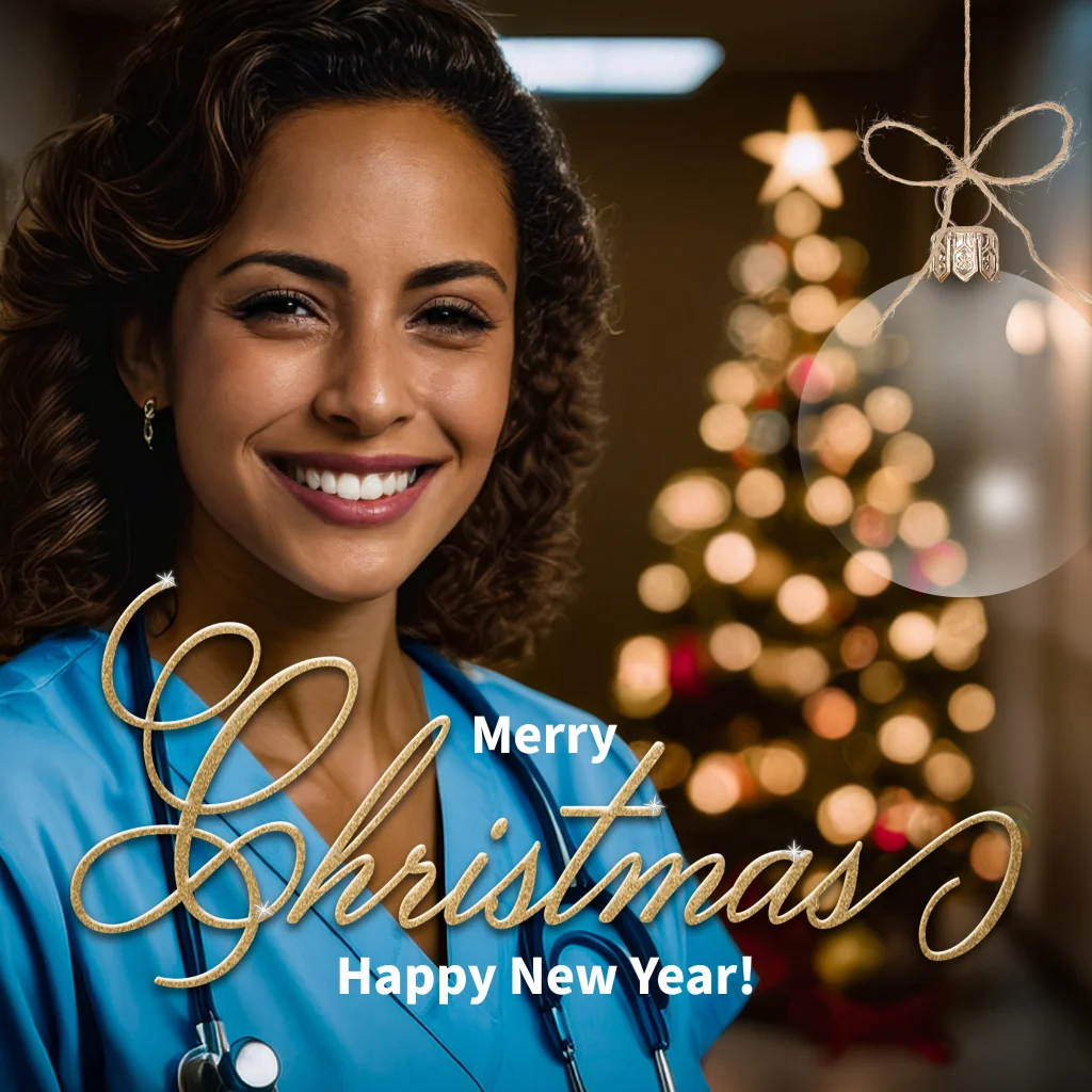 Een vrolijke kerstkaart voor de zorg met een verzorgster zuster, hulpverleenster op een feestelijk aangeklede gang. Eventueel plaats je aan de achterkant een foto en/of logo van je eigen bedrijf. (30321)