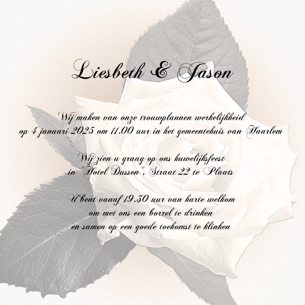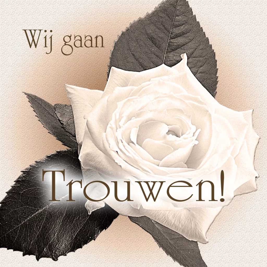 Stijlvolle huwelijkskaart met roos in wit en witte achtergrond. (165)