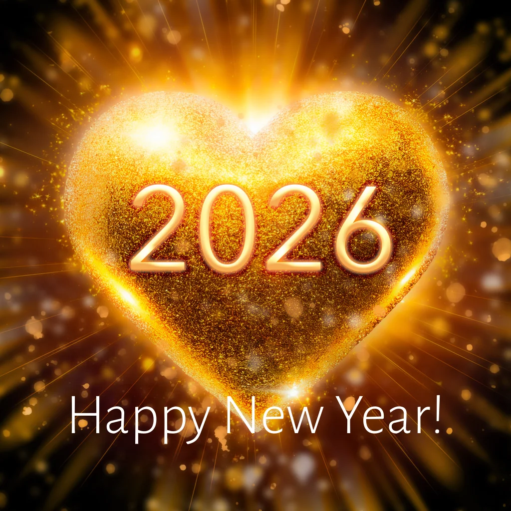 Een mooie nieuwjaarskaart met een oplichtend vurig hart en het jaartal 2026. (30318)