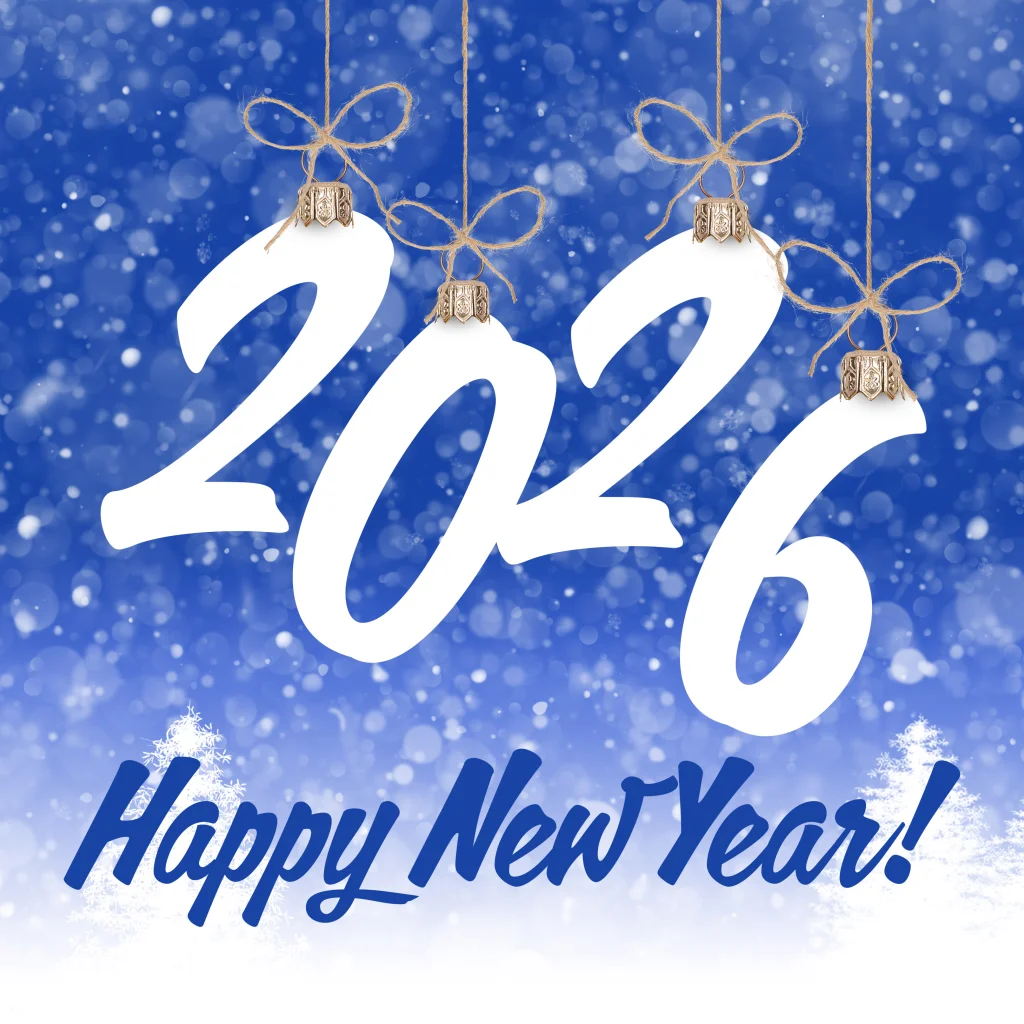Een vrolijke nieuwjaarskaart met winterse voorstelling en de cijfers als kerstballen(30334)