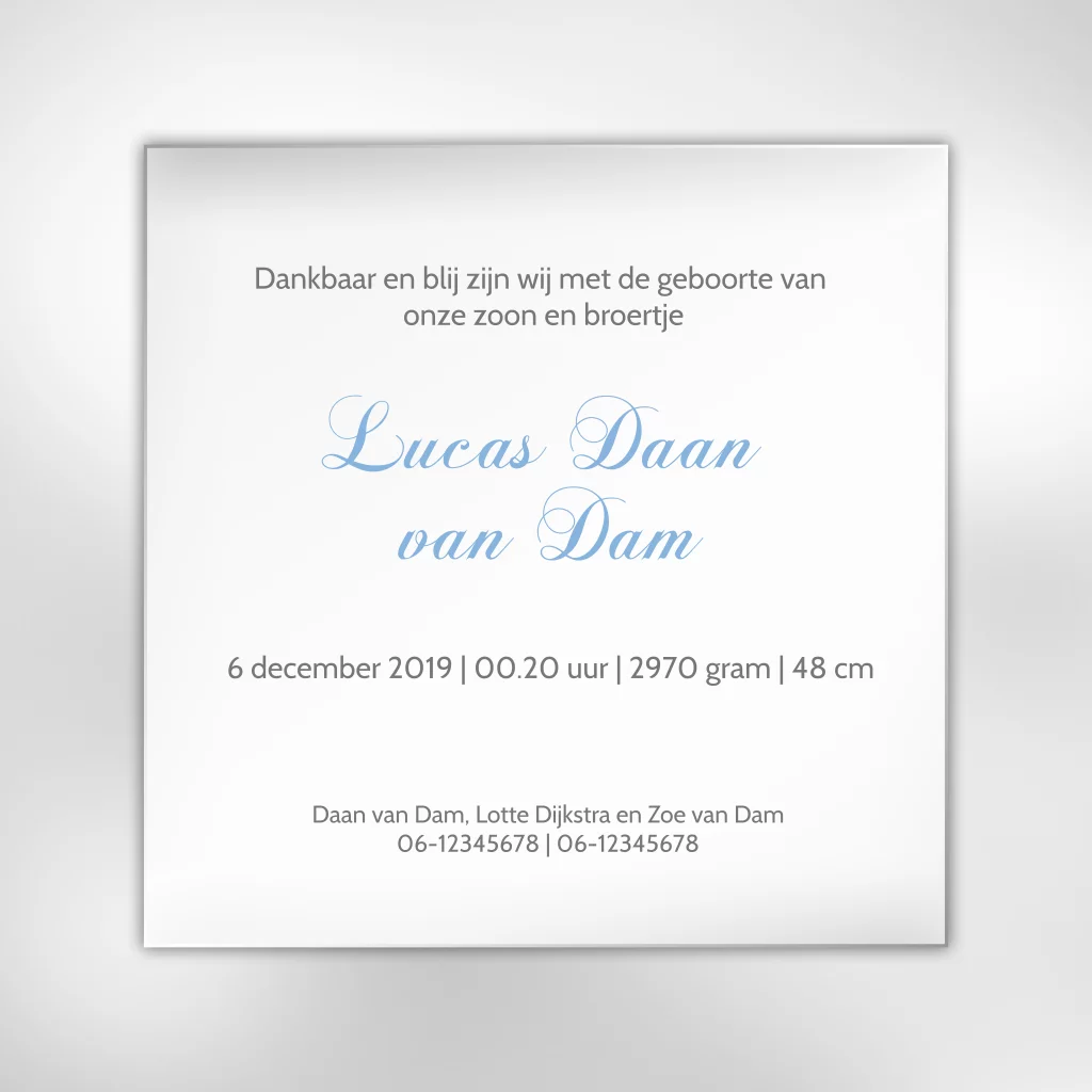 Stijlvol geboortekaartje jongen zilver met wit. Ruimte voor eigen foto op voorzijde en achterzijde. (2532)
