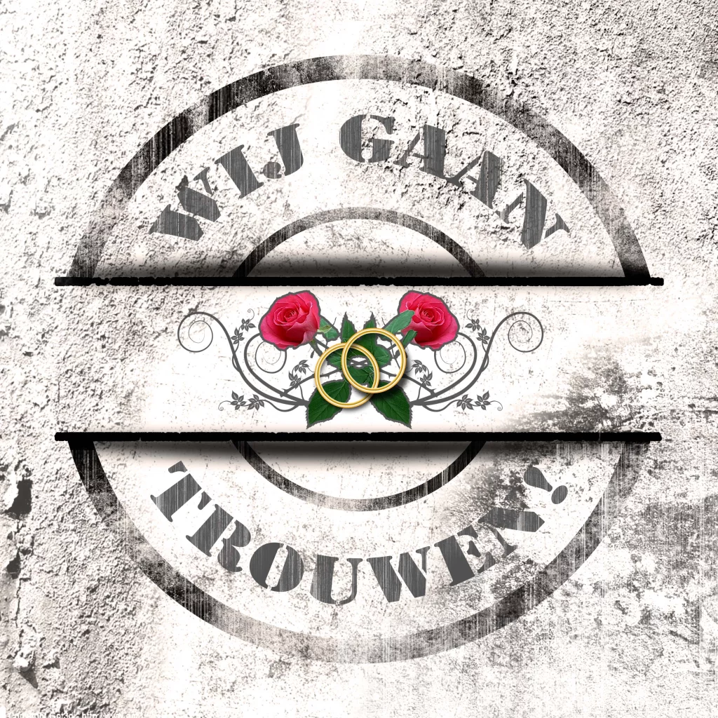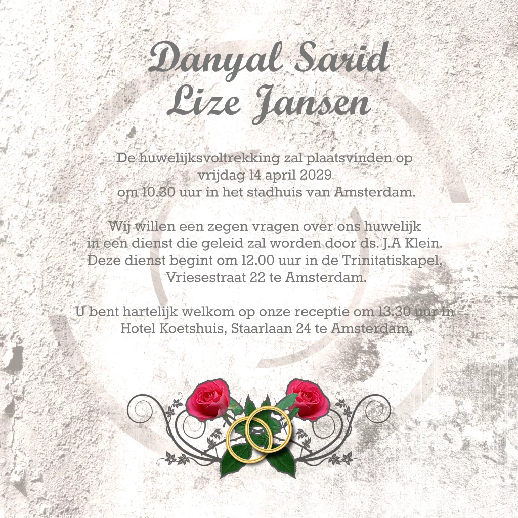 Stoere lichtgrijze trouwkaart met rode rozen en ringen. Trouwkaart in guns n roses vintage look