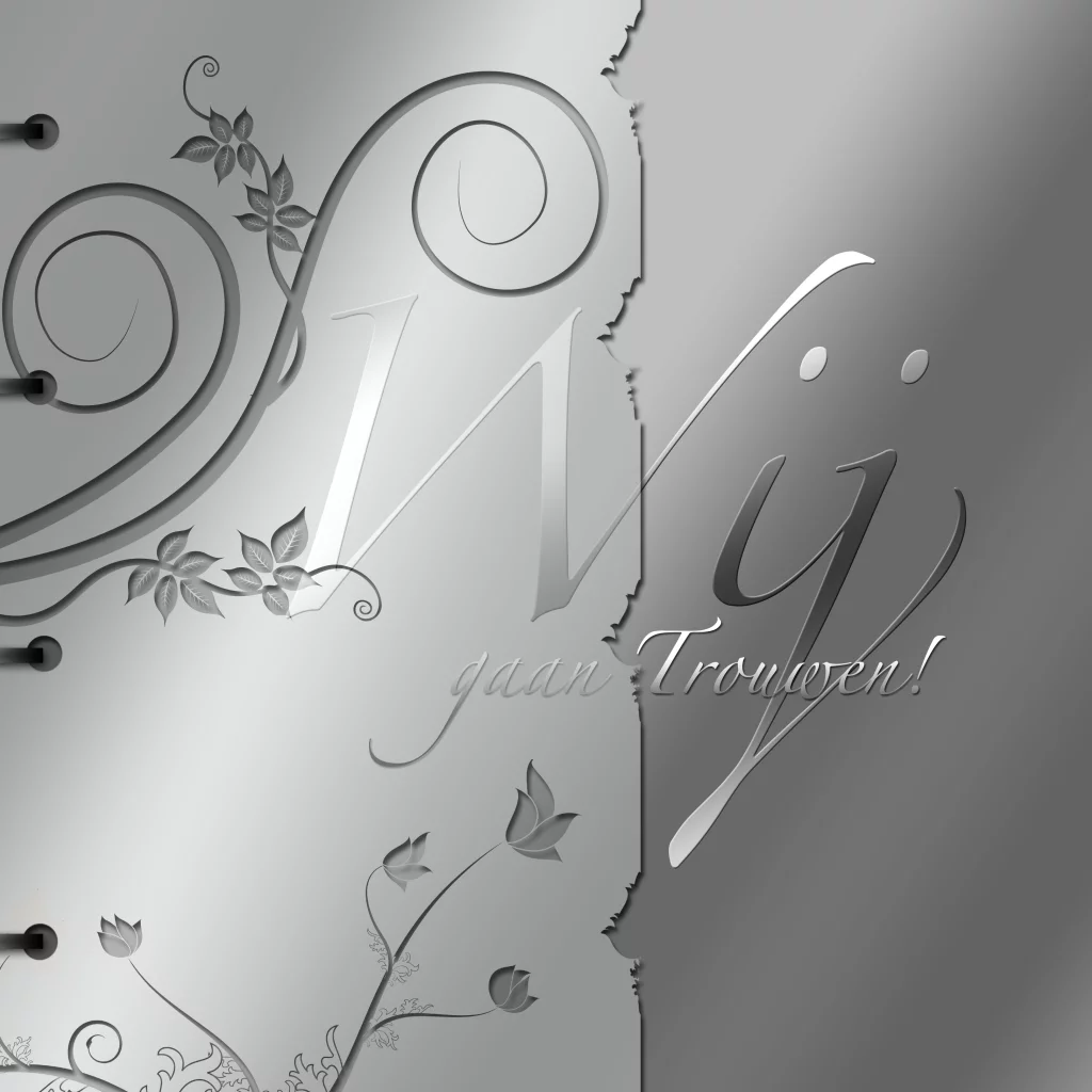 Een mooie vintage-look trouwkaart in zilver met bloemen en sierlijke ornamenten.